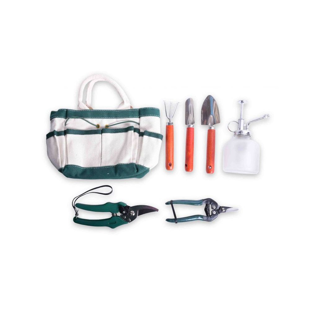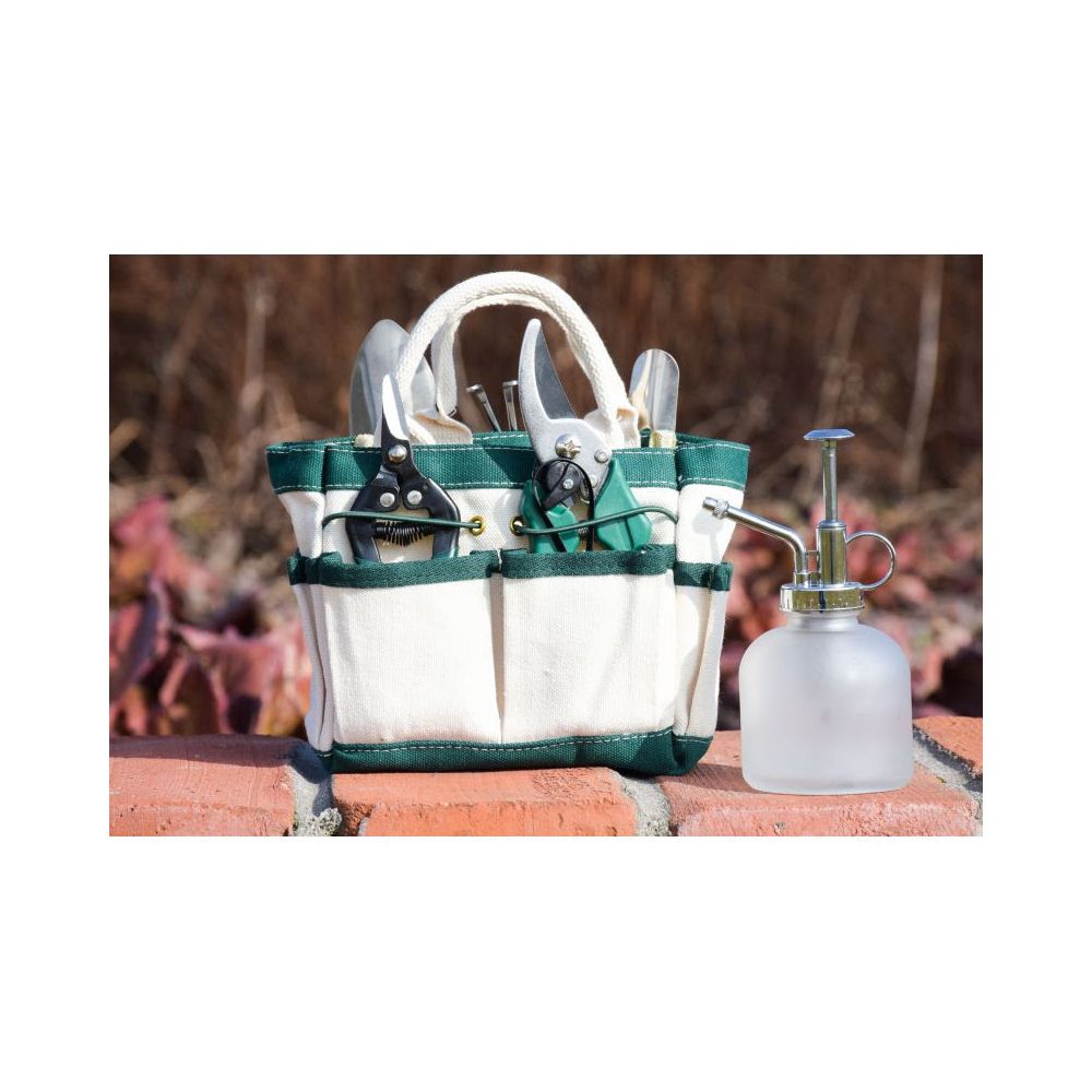 Ciekawa propozycja dla osób lubiących mieć wszystko zgromadzone w jednym podręcznym miejscu. Mini torba wyposażona we wszystkie podstawowe narzędzia, pozwoli w mgnieniu oka wyruszyć do prac w ogrodzie. W zestawie znajdują się: łopatka, grabki, dwa sekatory oraz zraszacz.