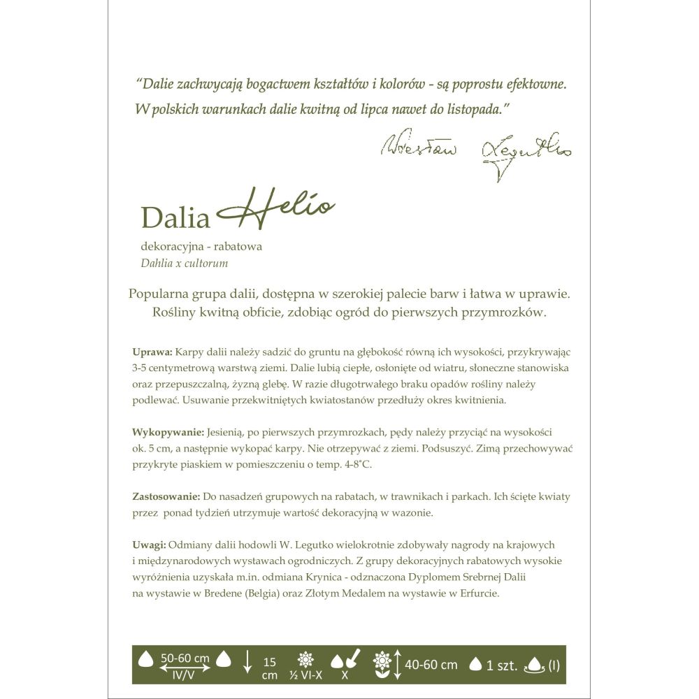 Uprawa: Karpy dalii należy sadzić do gruntu na głębokość równą ich wysokości, przykrywając 3-5 centymetrową warstwą ziemi. Dalie lubią ciepłe, osłonięte od wiatru, słoneczne stanowiska oraz przepuszczalną, żyzną glebę. W razie długotrwałego braku opadów rośliny należy podlewać. Usuwanie przekwitniętych kwiatostanów przedłuży okres kwitnienia.