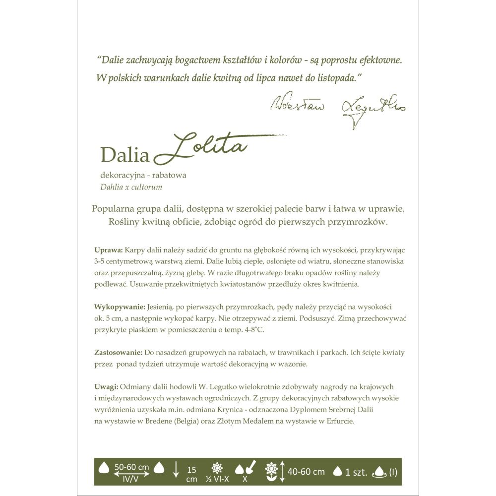 Uwagi: Odmiany dalii hodowli W. Legutko wielokrotnie zdobywały nagrody na krajowych i międzynarodowych wystawach ogrodniczych. Z grupy dekoracyjnych rabatowych wysokie wyróżnienia uzyskała m.in. odmiana Krynica - odznaczona Dyplomem Srebrnej Dalii na wystawie w Bredene (Belgia) oraz Złotym Medalem na wystawie w Erfurcie.