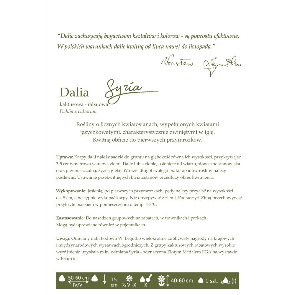 Uwagi: Odmiany dalii hodowli W. Legutko wielokrotnie zdobywały nagrody na krajowych i międzynarodowych wystawach ogrodniczych. Z grupy kaktusowych rabatowych wysokie wyróżnienia uzyskała m.in. odmiana Syria - odznaczona Złotym Medalem EGA na wystawie w Erfurcie.