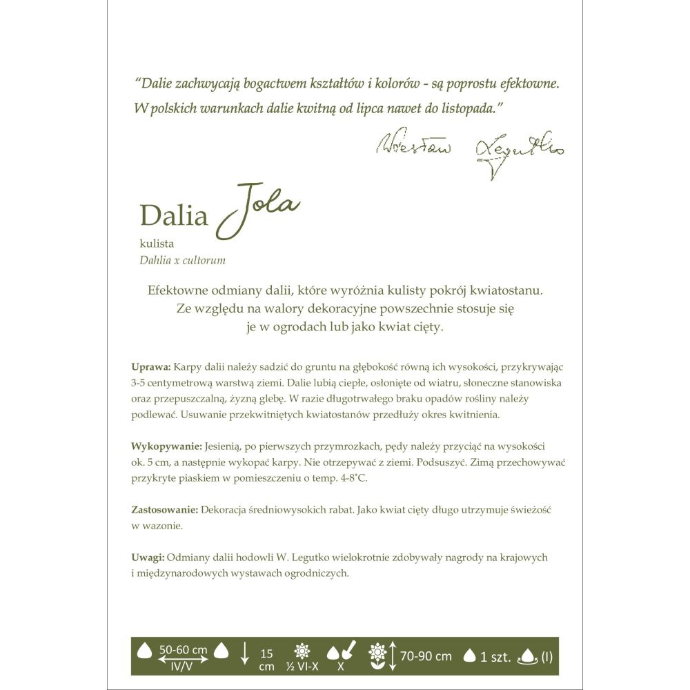 Uwagi: Odmiany dalii hodowli W. Legutko wielokrotnie zdobywały nagrody na krajowych i międzynarodowych wystawach ogrodniczych.