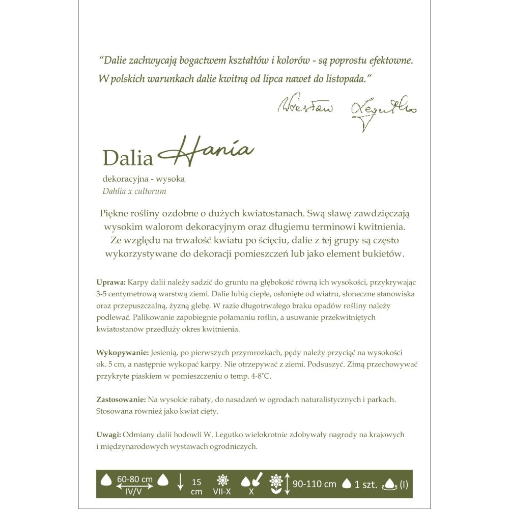 Uprawa: Karpy dalii należy sadzić do gruntu na głębokość równą ich wysokości, przykrywając 3-5 centymetrową warstwą ziemi. Dalie lubią ciepłe, osłonięte od wiatru, słoneczne stanowiska oraz przepuszczalną, żyzną glebę. W razie długotrwałego braku opadów rośliny należy podlewać. Usuwanie przekwitniętych kwiatostanów przedłuży okres kwitnienia.