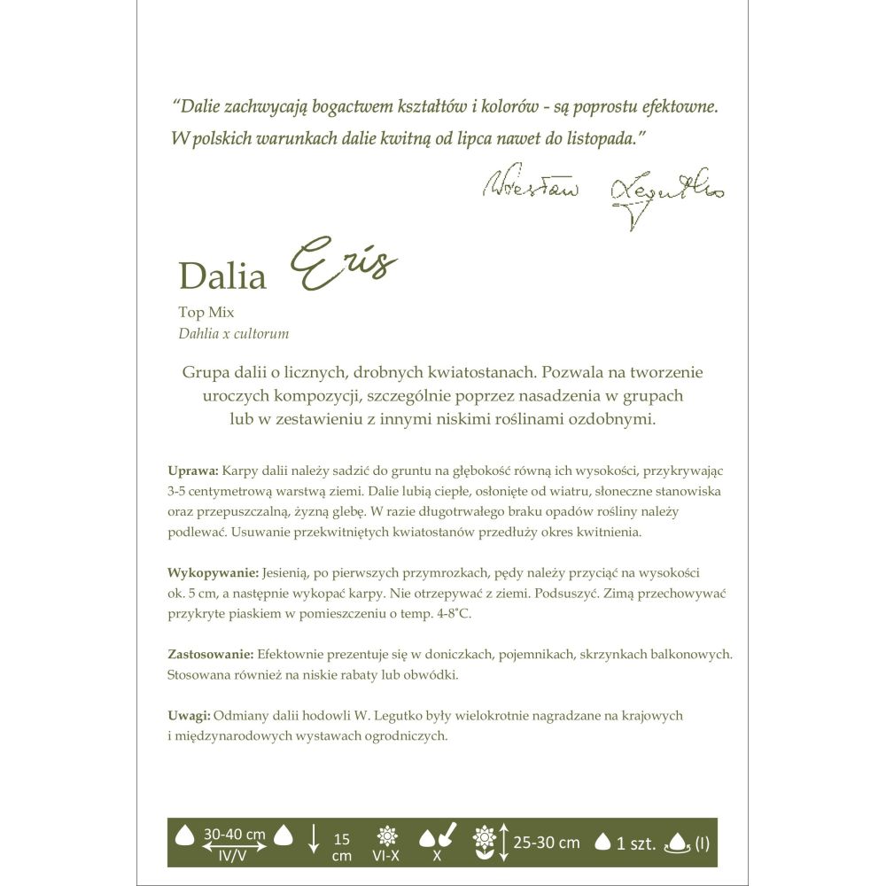 Uprawa: Karpy dalii należy sadzić do gruntu na głębokość równą ich wysokości, przykrywając 3-5 centymetrową warstwą ziemi. Dalie lubią ciepłe, osłonięte od wiatru, słoneczne stanowiska oraz przepuszczalną, żyzną glebę. W razie długotrwałego braku opadów rośliny należy podlewać. Usuwanie przekwitniętych kwiatostanów przedłuży okres kwitnienia.