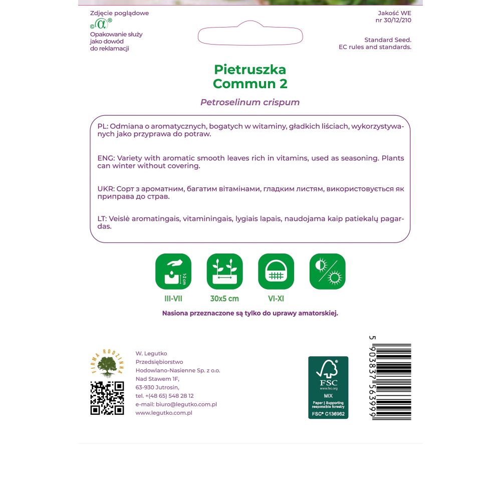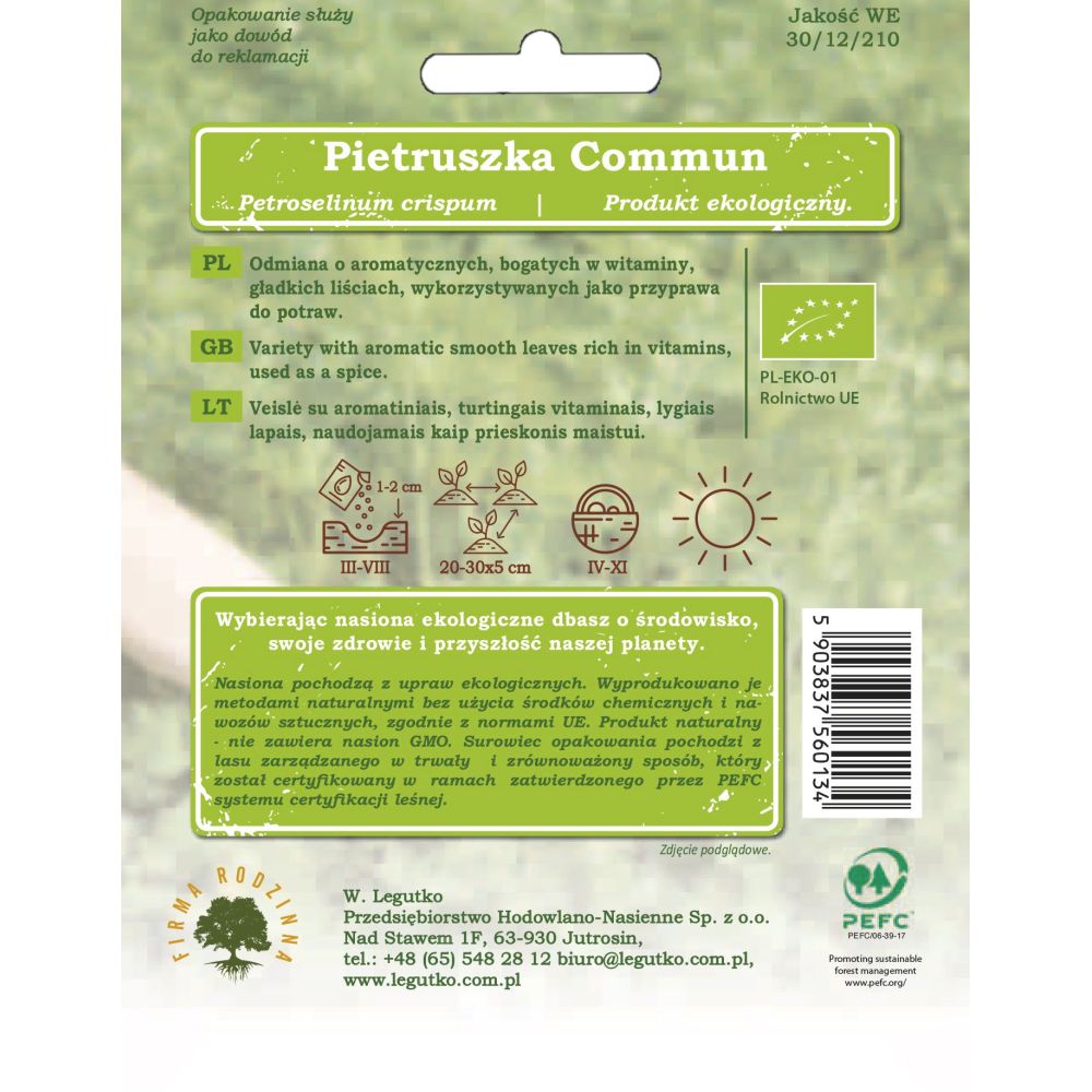 Nasiona pochodzą z upraw ekologicznych. Wyprodukowano je metodami naturalnymi bez użycia środków chemicznych i nawozów sztucznych, zgodnie z normami UE. Produkt naturalny - nie zawiera nasion GMO. Papier pod opakowanie wytworzono z materiałów pochodzących z dobrze zarządzanych lasów posiadających certyfikat FSC i innych kontrolowanych źródeł.