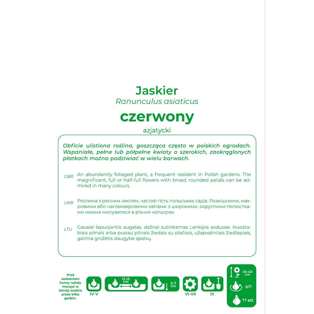 Uprawa: Przed wysadzeniem bulwy należy moczyć w letniej wodzie przez kilka godzin, a następnie sadzić do ziemi piaszczysto-gliniastej, na głębokość 5-7 cm. Jaskier to mało wymagająca pod względem uprawy roślina. Najlepiej rośnie w zacisznym, ciepłym i słonecznym miejscu. Podlewanie rośliny należy rozpocząć po pojawieniu się liści, a zaprzestać po jej przekwitnięciu. Zaleca się usuwanie suchych kwiatów w celu przedłużenia okresu kwitnienia.