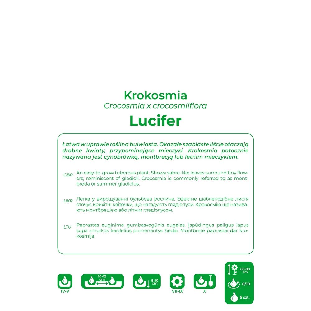 Uprawa: Bulwy krokosmi wysadzać do żyznej, próchnicznej gleby. Roślina lubi wilgotne, osłonięte od wiatru, słoneczne lub pół cieniste stanowiska. Pielęgnując ją, należy pamiętać o odchwaszczeniu podłoża, a w czasie długotrwałej suszy - o częstym podlewaniu. Przekwitłe kwiatostany powinny być na bieżąco usuwane.