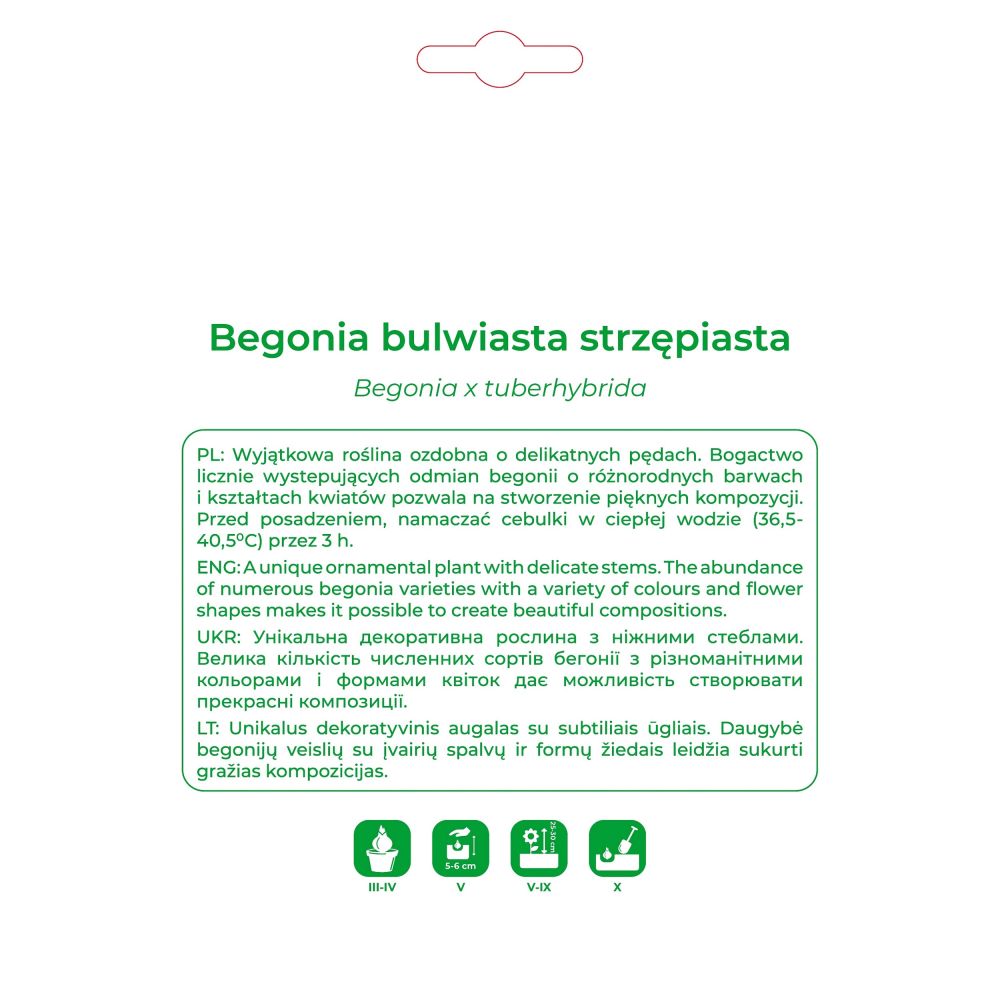 Uprawa: Begonia najlepiej rośnie w miejscach lekko zacienionych i osłoniętych od wiatru. Jest wymagająca pod względem podłoża – gleba powinna być próchniczna, przepuszczalna oraz lekko kwaśna. Bulwy należy wysadzić do doniczek w domu wypukłą stroną do dołu, przykryć 0,5 - 1 cm warstwą podłoża. Begonia w okresie wzrostu wymaga systematycznego podlewania. Kwitnie od maja do września. Przekwitłe kwiaty należy usuwać, dzięki temu przedłuży się okres kwitnienia.