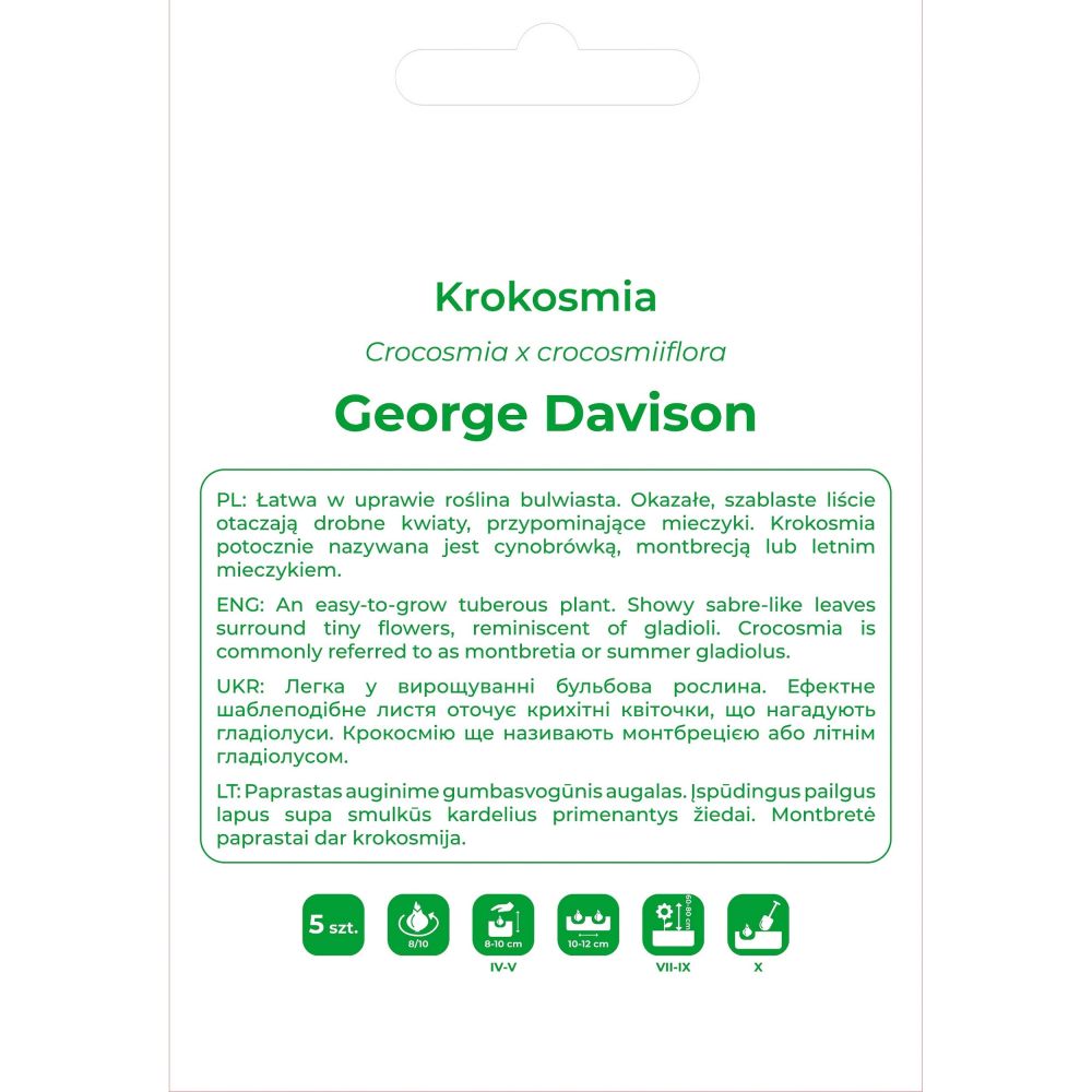 Uprawa: Bulwy krokosmi wysadzać do żyznej, próchnicznej gleby. Roślina lubi wilgotne, osłonięte od wiatru, słoneczne lub półcieniste stanowiska. Pielęgnując ją, należy pamiętać o odchwaszczeniu podłoża, a w czasie długotrwałej suszy - o częstym podlewaniu. Przekwitłe kwiatostany powinny być na bieżąco usuwane.