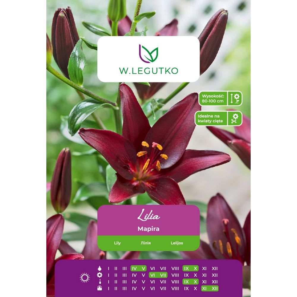 Uprawa: Starannie uprawiona, przepuszczalna i zasobna w składniki pokarmowe gleba to odpowiednie podłoże dla uprawy lilii. Większość odmian preferuje słoneczne stanowiska, niektóre tolerują półcień. Głębokość sadzenia cebuli należy dostosować do jej wielkości. Zalecamy sadzić je ostrożne, tak by nie odłamać pędów. Rośliny można uprawiać przez kilka lat na tym samym stanowisku, pod warunkiem okrycia na zimę. Przekwitłe kwiaty należy usuwać. W lecie warto ściółkować rośliny zmieloną korą lub torfem, co chroni glebę przed zachwaszczeniem i wysychaniem. Cebule można przesadzać jesienią bezpośrednio w nowe miejsce lub po wykopaniu przechować je do wiosny w temp. 2-4°C, przykryte torfem.