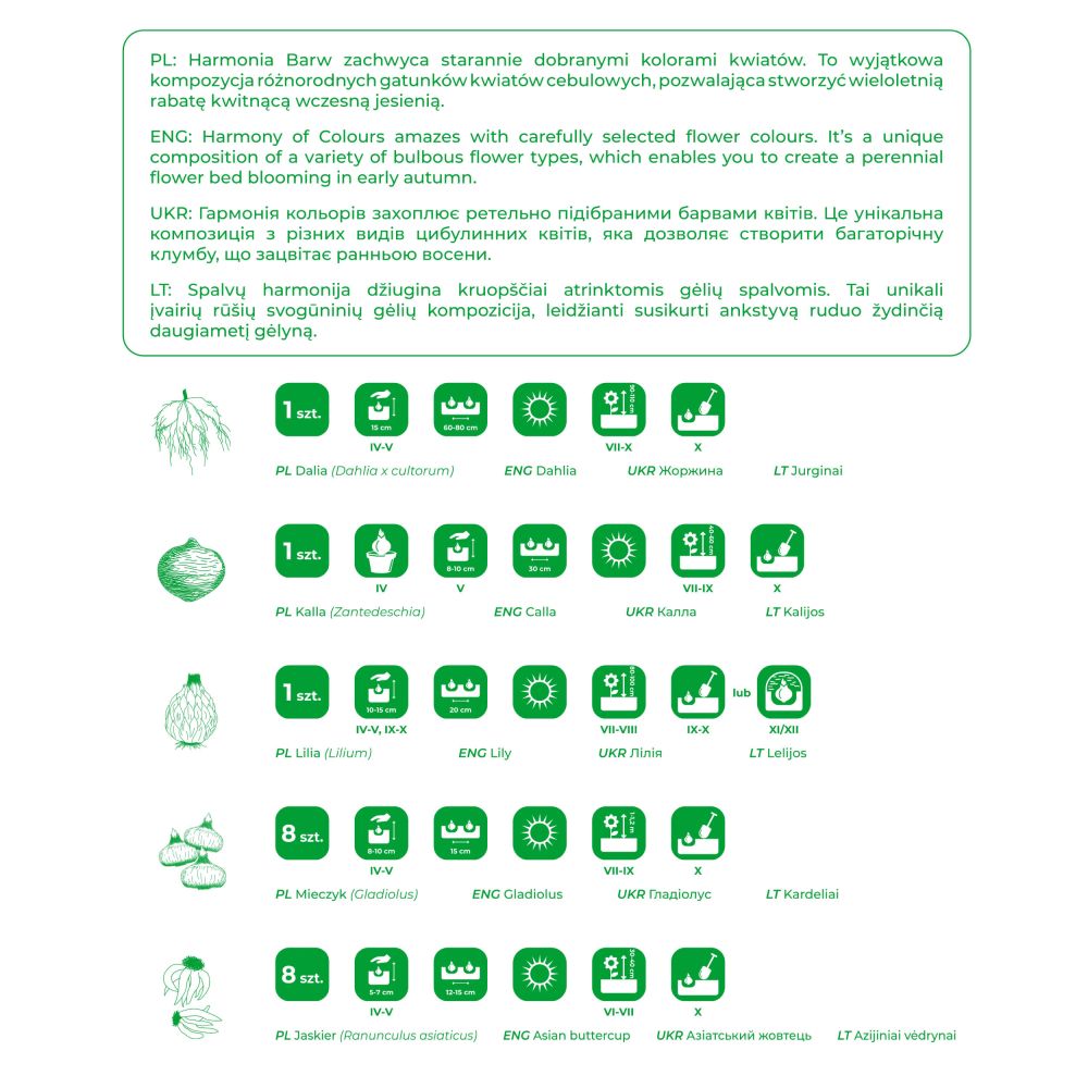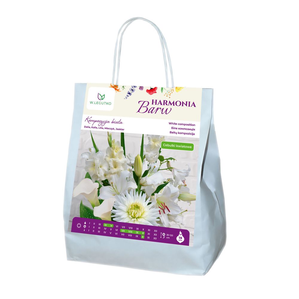Długo i obficie kwitnące rośliny o okazałych kwiatostanach. Łatwe w uprawie. Karpy dalii należy sadzić do gruntu na głębokość równą ich wysokości, przykrywając 3-5 centymetrową warstwą ziemi. Dalie lubią ciepłe, osłonięte od wiatru, słoneczne stanowiska oraz przepuszczalną, żyzną glebę. Jesienią, po pierwszych przymrozkach, pędy należy przyciąć na wysokość ok. 5 cm nad ziemią, a następnie wykopać karpy. Nie otrzepywać ziemi. Podsuszyć. Zimą przechowywać przykryte piaskiem w pomieszczeniu o temp. 5-8°C. Mieszanka gatunków roślin ozdobnych w kolorze białym.