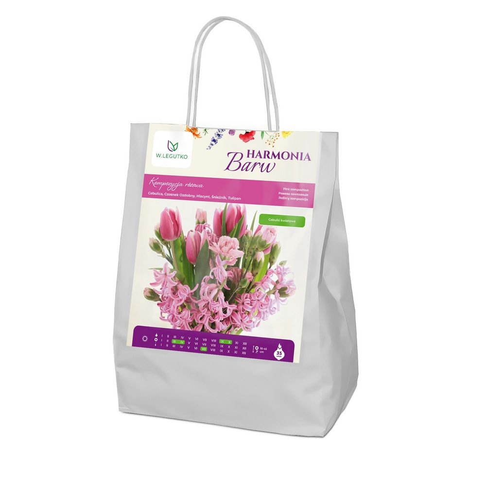 Kompozycja różowa- cebulica dzwonkowata (7 szt.), czosnek Ostrowskiego (10 szt.), hiacynt Pink Pearl (3 szt.), śnieżnik Forbesa (10 szt.), tulipan Angelique (5 szt.)