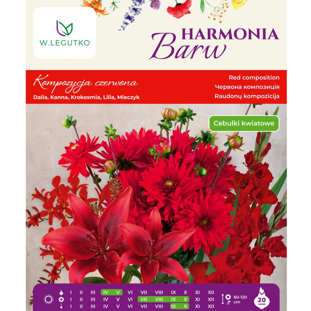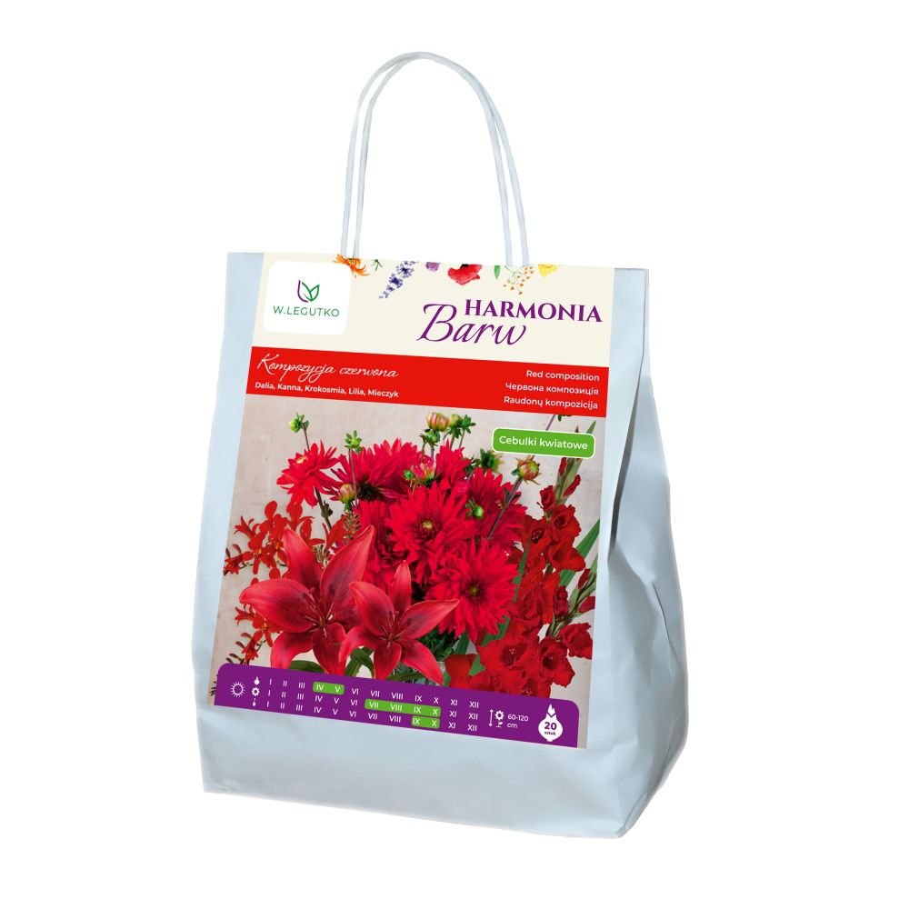 Kompozycja czerwona - 20szt. - Kanna President - 1szt. - Krokosmia Lucifer- 8szt. - Dalia ogrodowa Korsarz - 1szt. - Lilia Black Out - 1szt. - Mieczyk Oscar - 9szt.