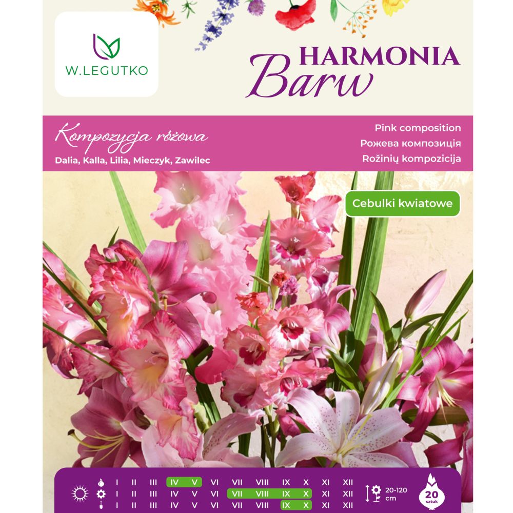 Kompozycja różowa - 20szt. - Dalia ogrodowa Ozyrys - 1szt.( Dahlia x cultorum )- Zawilec The Admiral - 9szt. ( Anemone coronaria ) - Mieczyk T-512 -8szt .( Gladiolus ) - Lilia Star Gazer - 1szt.( Lilium) - Kalla Pink Persuasion - 1szt.( Zantedeschia )