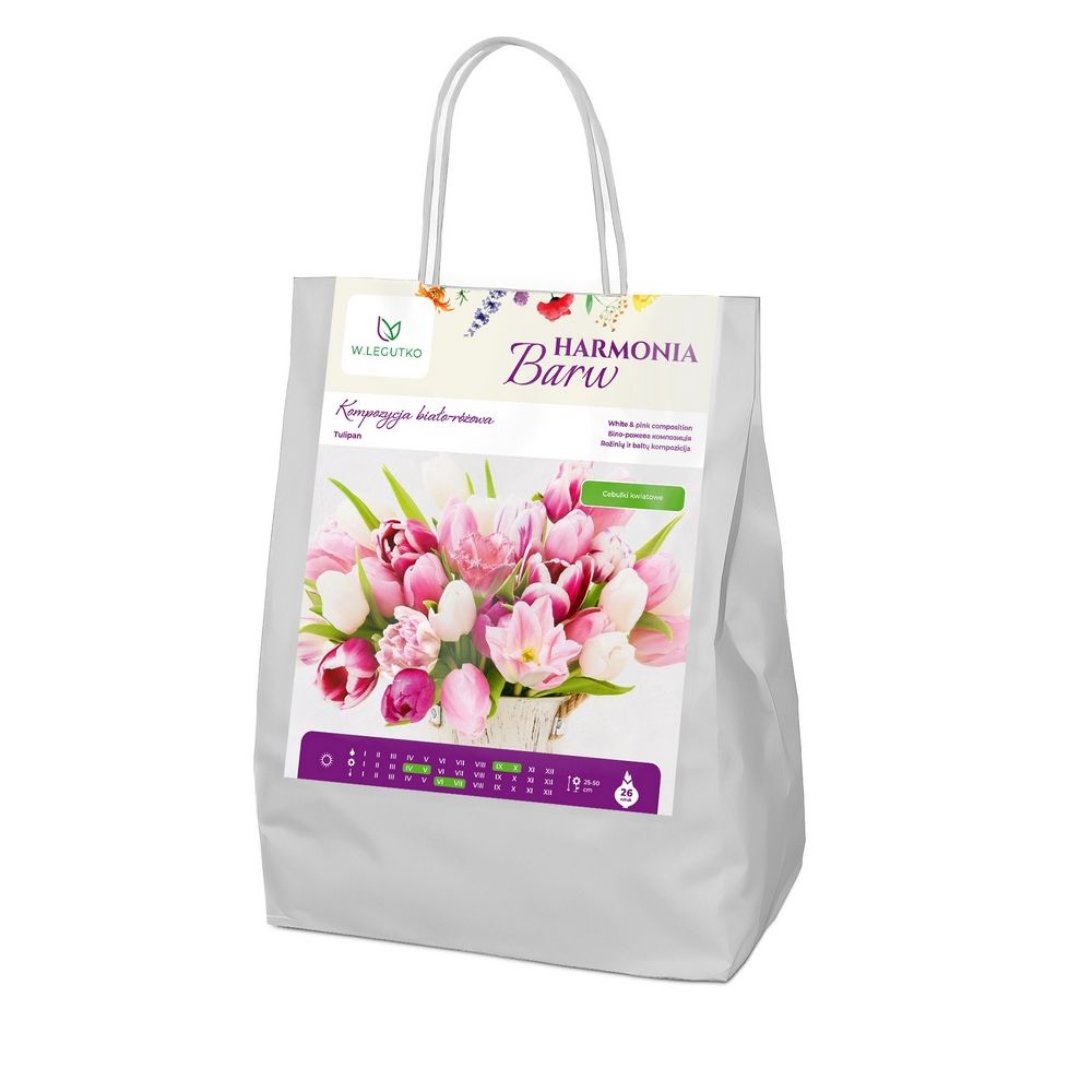 Kompozycja biało-różowa - tulipan Border Legend (5 szt.), tulipan Holland Chic (5 szt.), tulipan Angelique (5 szt.), tulipan Fancy Frills (5 szt.), tulipan Mata Hari (6 szt.)
