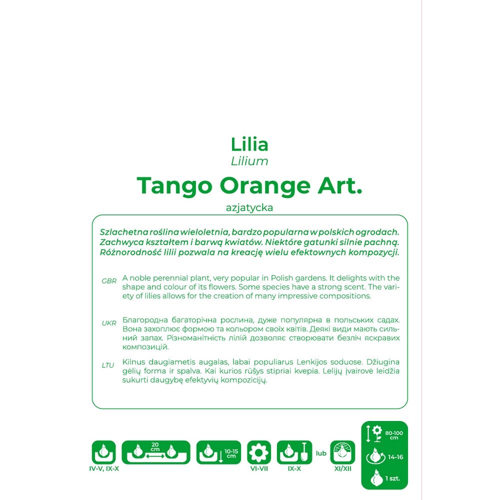 Uprawa: Starannie uprawiona, przepuszczalna i zasobna w składniki pokarmowe gleba to odpowiednie podłoże dla uprawy lilii. Większość odmian preferuje słoneczne stanowiska, niektóre tolerują półcień. Głębokość sadzenia cebuli należy dostosować do jej wielkości. Zalecamy sadzić je ostrożne, tak by nie odłamać pędów. Rośliny można uprawiać przez kilka lat na tym samym stanowisku, pod warunkiem okrycia na zimę. Przekwitłe kwiaty należy usuwać. W lecie warto ściółkować rośliny zmieloną korą lub torfem, co chroni glebę przed zachwaszczeniem i wysychaniem. Cebule można przesadzać jesienią bezpośrednio w nowe miejsce lub po wykopaniu przechować je do wiosny w temp. 2-4°C, przykryte torfem.