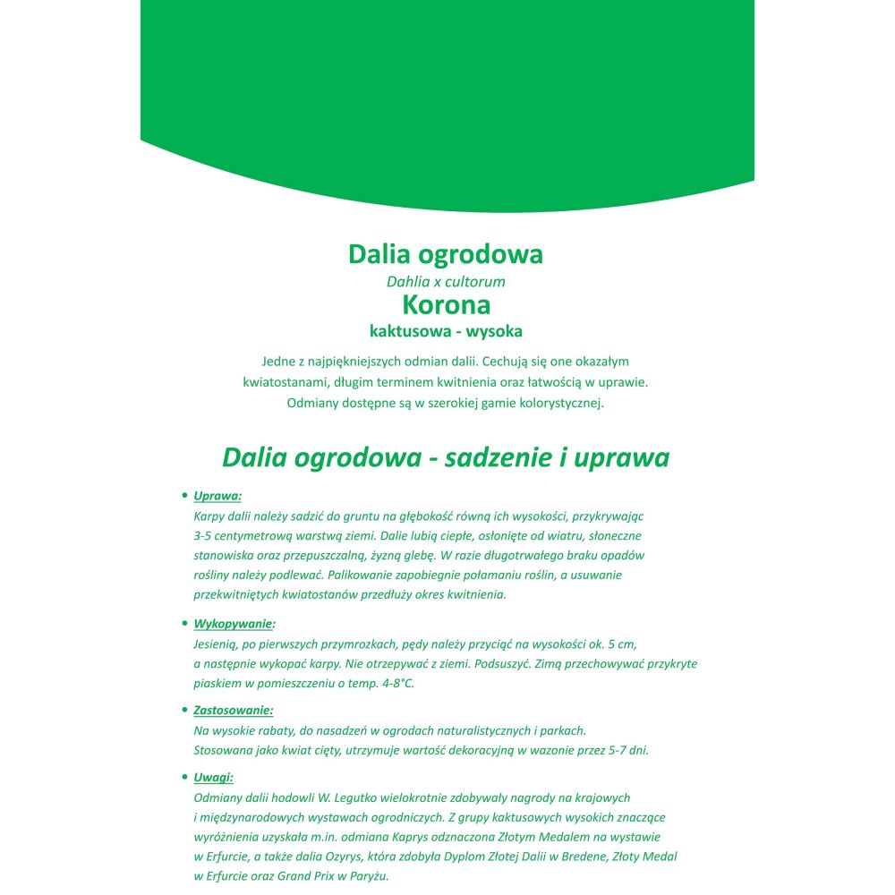 Uprawa: Karpy dalii należy sadzić do gruntu na głębokość równą ich wysokości, przykrywając 3-5 centymetrową warstwą ziemi. Dalie lubią ciepłe, osłonięte od wiatru, słoneczne stanowiska oraz przepuszczalną, żyzną glebę. W razie długotrwałego braku opadów rośliny należy podlewać. Palikowanie zapobiegnie połamaniu roślin, a usuwanie przekwitniętych kwiatostanów przedłuży okres kwitnienia.
