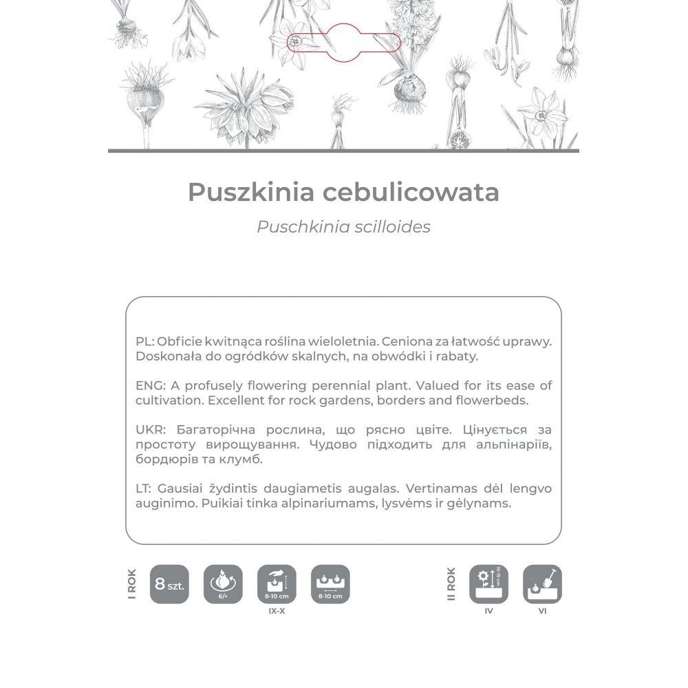 Uwagi: Puszkinie stanowią świetne tło dla niskich roślin cebulowych o wyrazistych barwach, np. czerwonych tulipanów botanicznych.