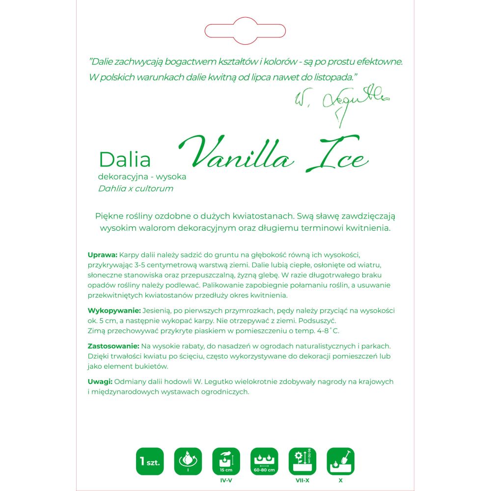 Uprawa: Karpy dalii należy sadzić do gruntu na głębokość równą ich wysokości, przykrywając 3-5 centymetrową warstwą ziemi. Dalie lubią ciepłe, osłonięte od wiatru, słoneczne stanowiska oraz przepuszczalną, żyzną glebę. W razie długotrwałego braku opadów rośliny należy podlewać. Palikowanie zapobiegnie połamaniu roślin, a usuwanie przekwitniętych kwiatostanów przedłuży okres kwitnienia.