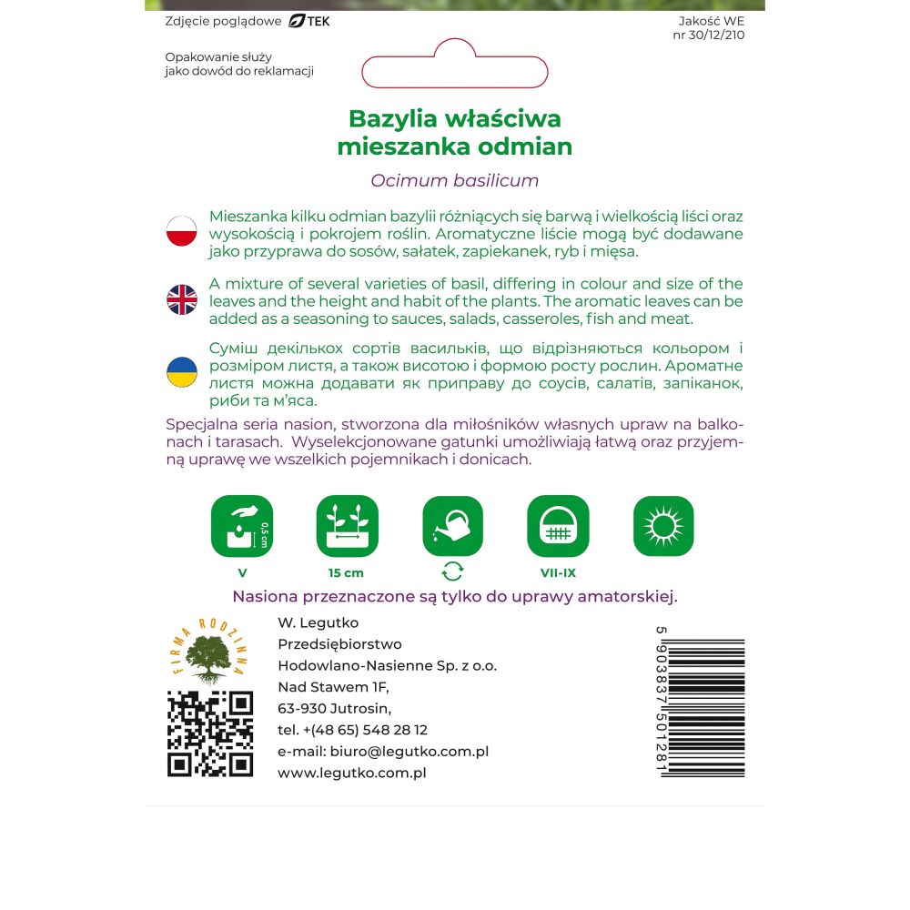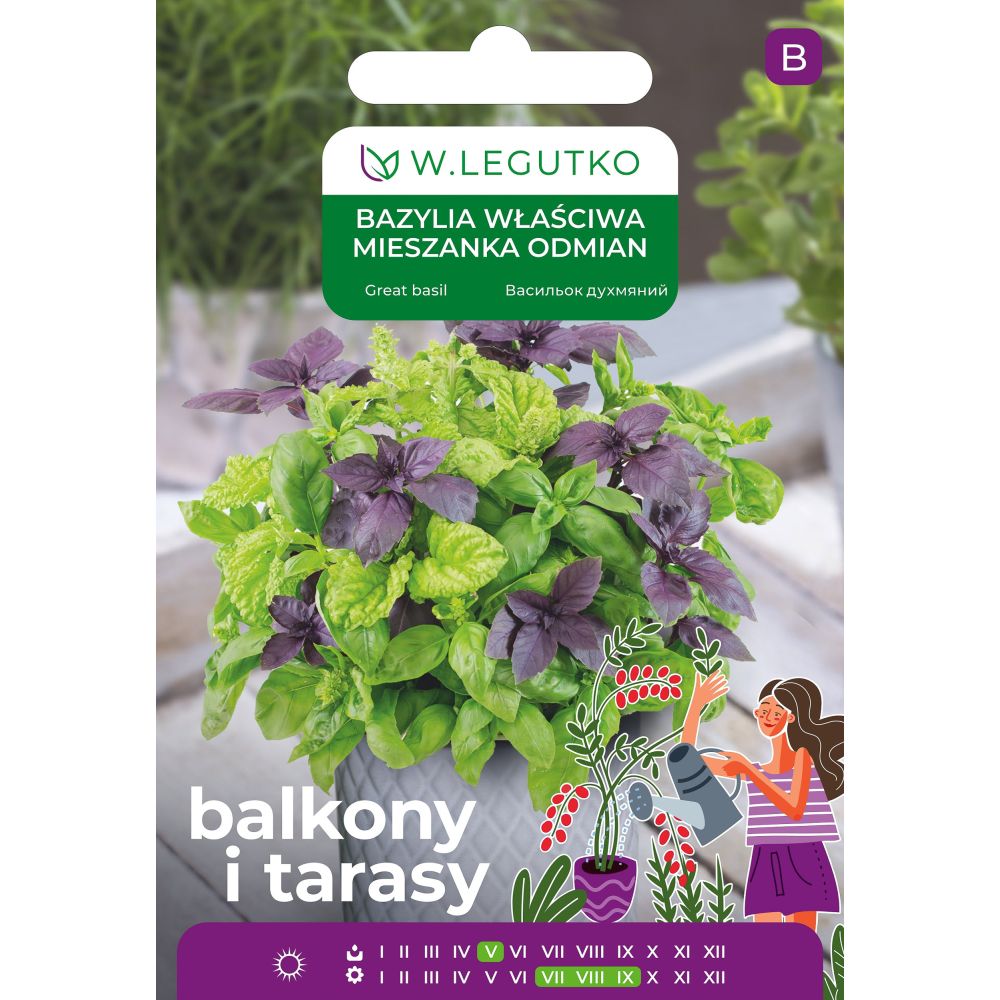 Mieszanka kilku odmian bazylii różniących się barwą i dorastającą do 20-30 cm wysokości. Liście bazylii mogą być dodawane do sosów, sałatek, zapiekanek, ryb i mięsa. Lubi stanowisko słoneczne.