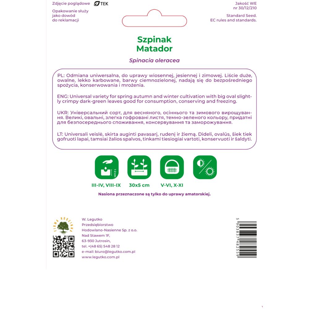Odmiana o dużych, owalnych lub wydłużonych, lekko karbowanych liściach o ciemnozielonym kolorze. Nazwa łacińska: Spinacia oleracea. Roślina stosowana do uprawy wiosennej, jesiennej. Mało skłonna do wybijania w pędy nasienne, odmiana daje bardzo dobry surowiec do mrożenia oraz bezpośredniego spożycia. Szpinak Matador jest doskonałym dodatkiem do sałatek czy dekoracji potraw, bogatym w składniki odżywcze – jego wszechstronność sprawia, że świetnie sprawdza się w różnych daniach.