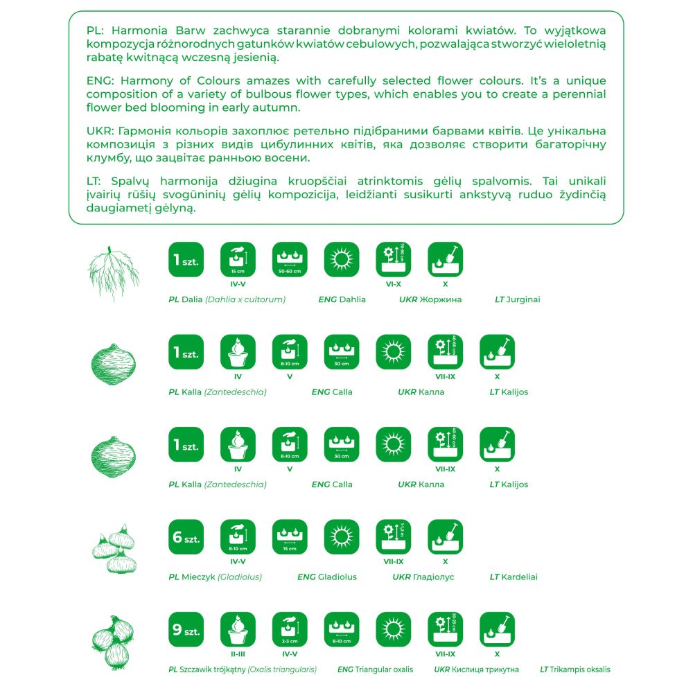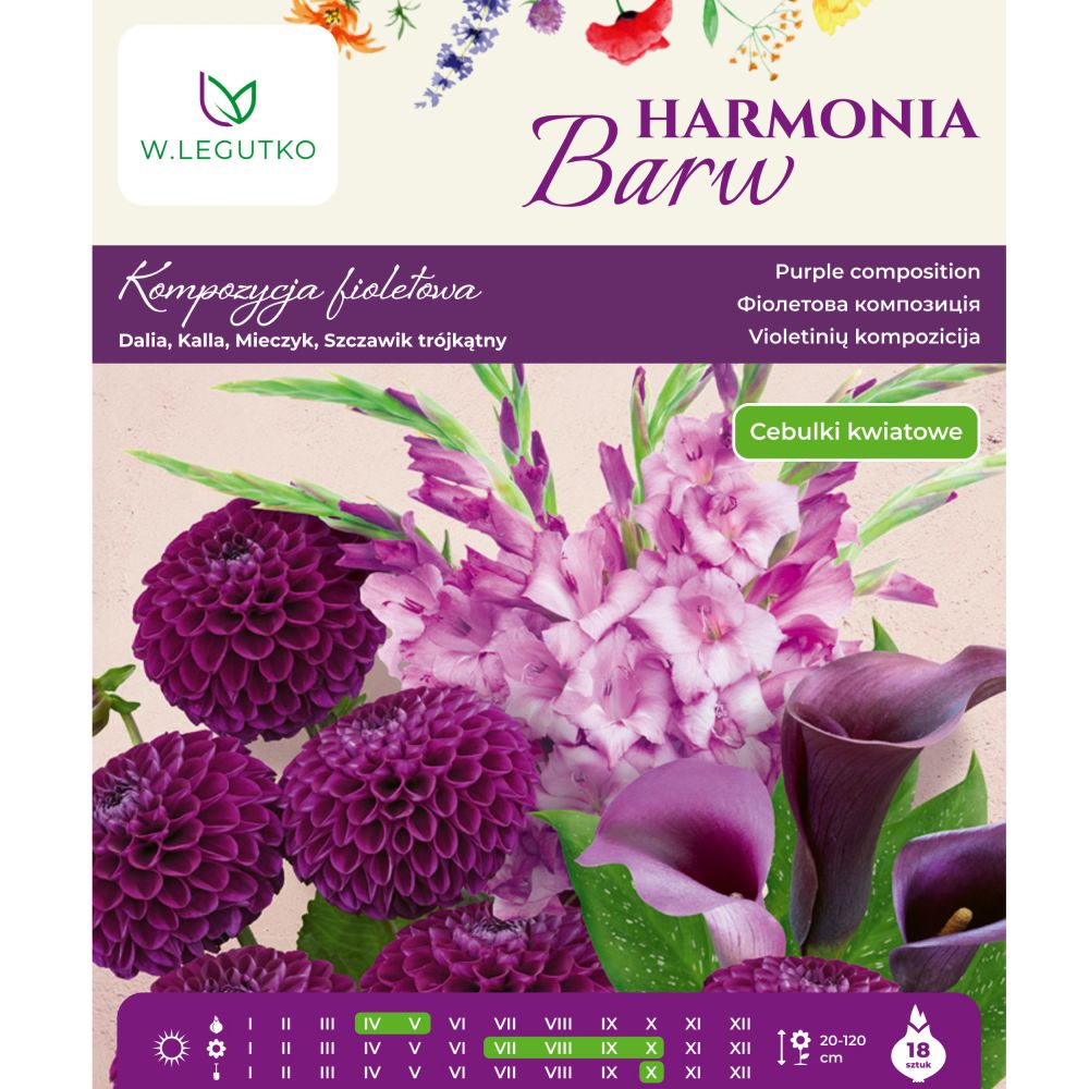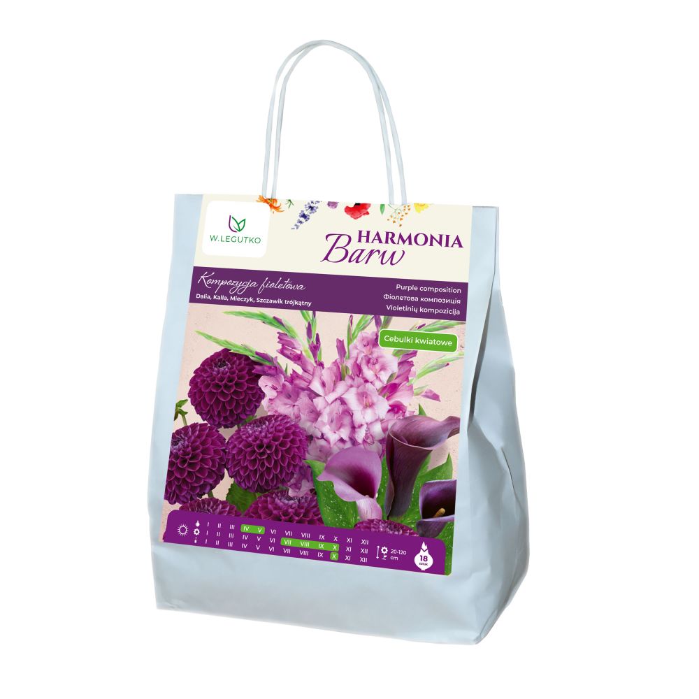 Kompozycja fioletowa - 18szt. - Dalia ogrodowa - 1szt. - Mieczyk Velvet Eyes - 6szt. - Kalla Chianti - 1 szt. - Kalla Lavender Gem - 1szt. - Szczawik trójkątny - 9szt.