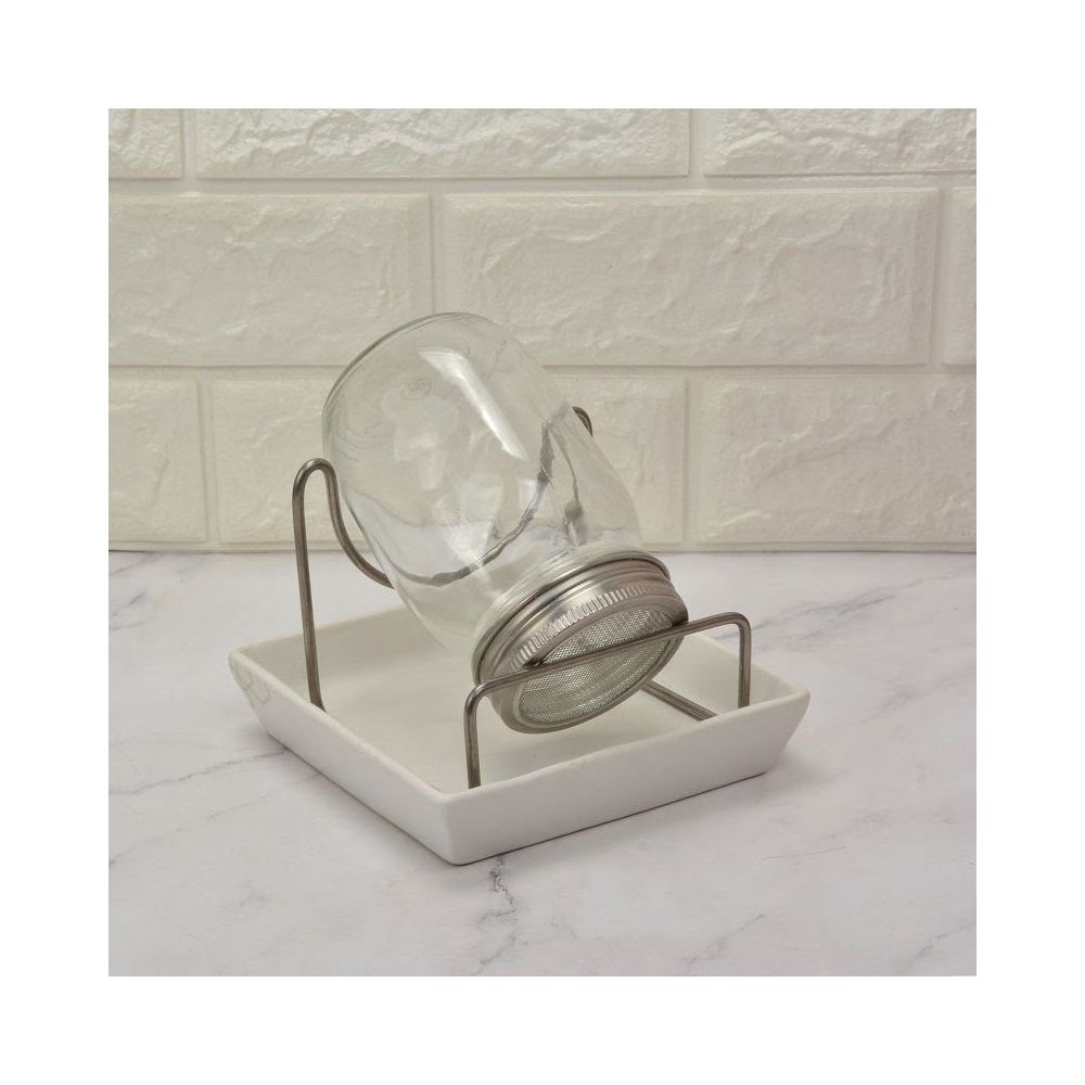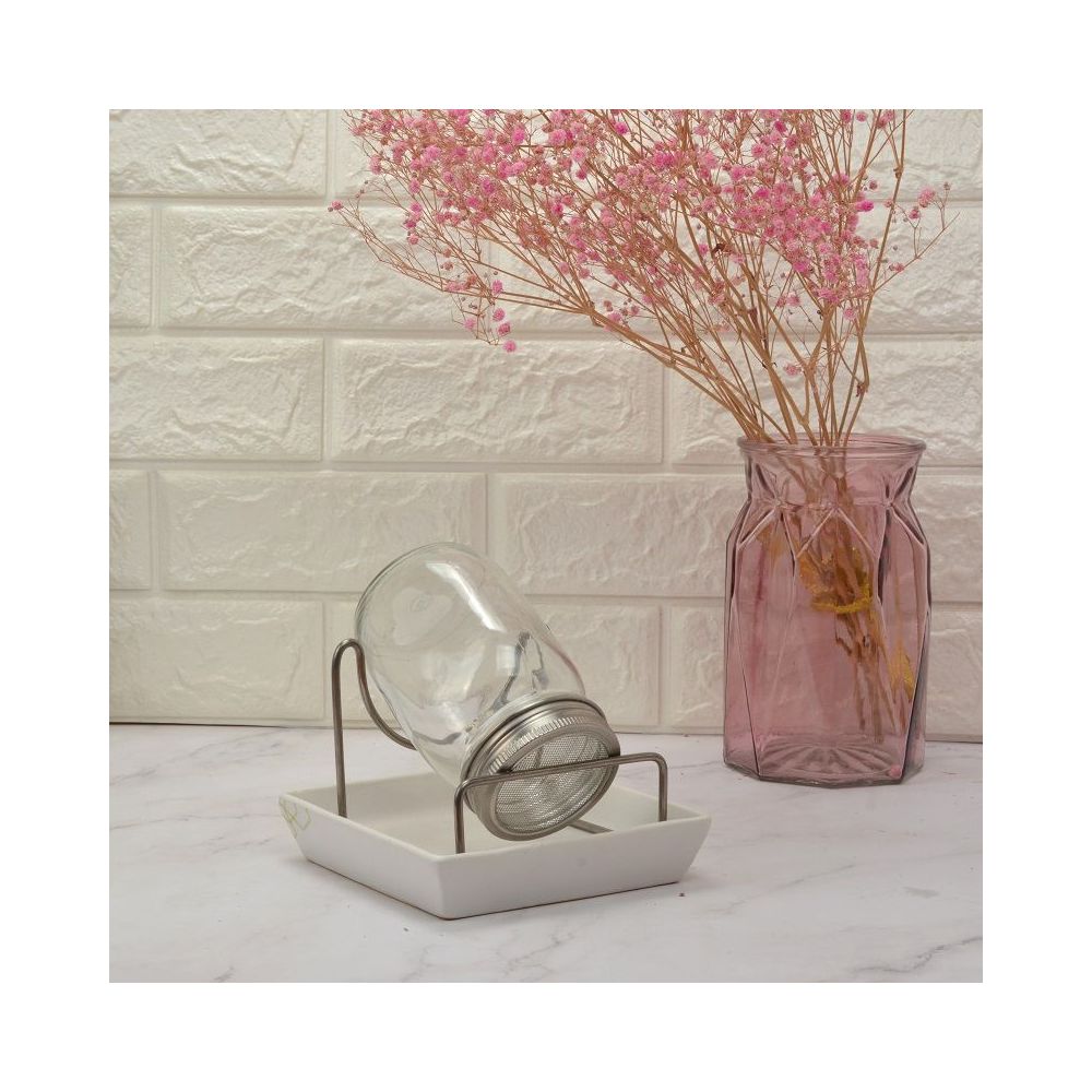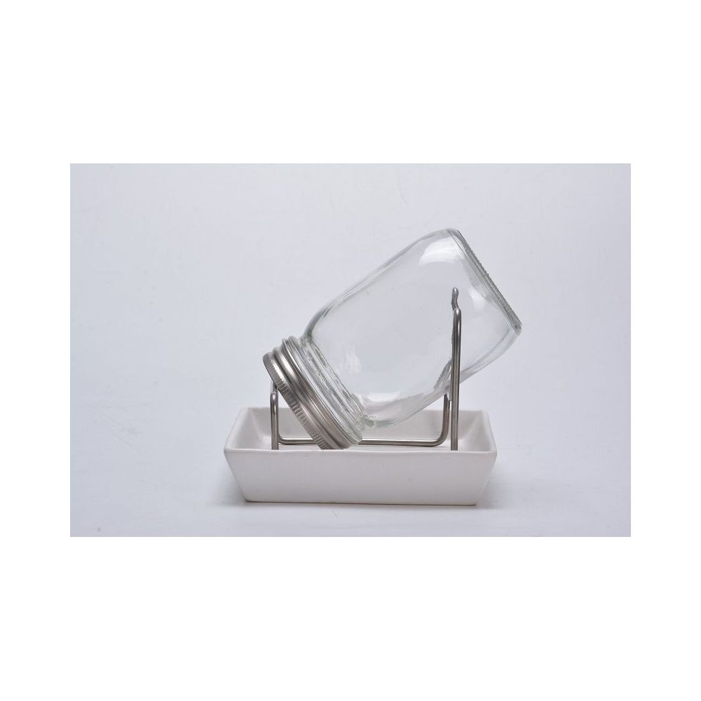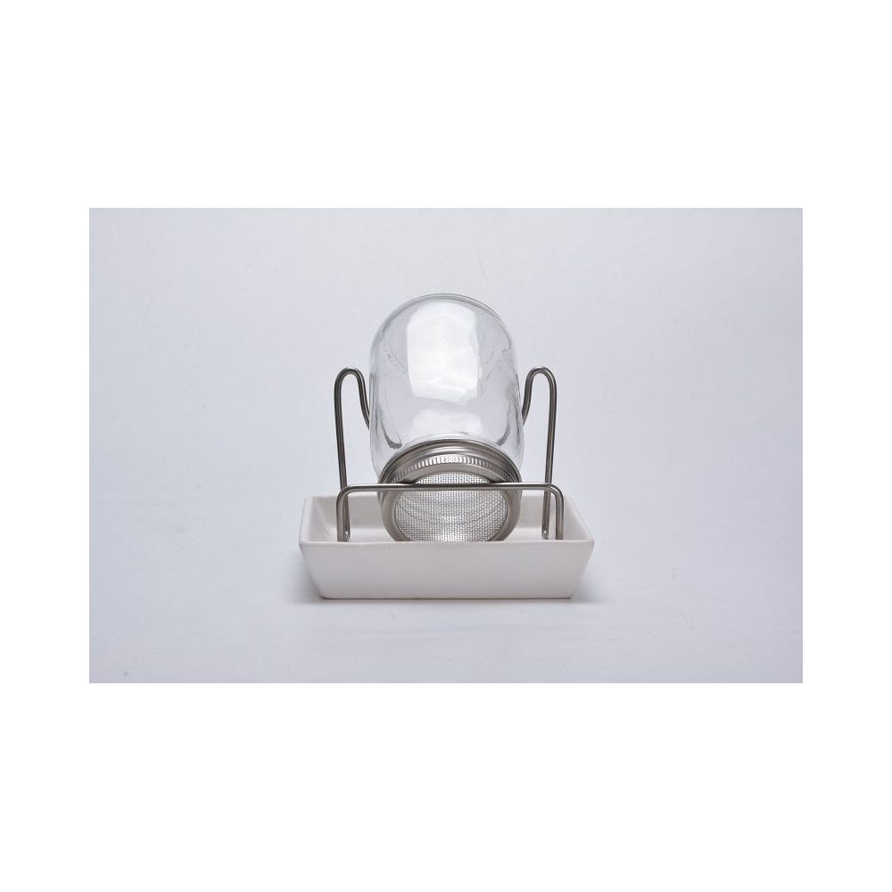 Zawartość: Słoik z nierdzewną, metalową zakrętką z siateczką, nierdzewny, metalowy stojak, ceramiczna podstawka