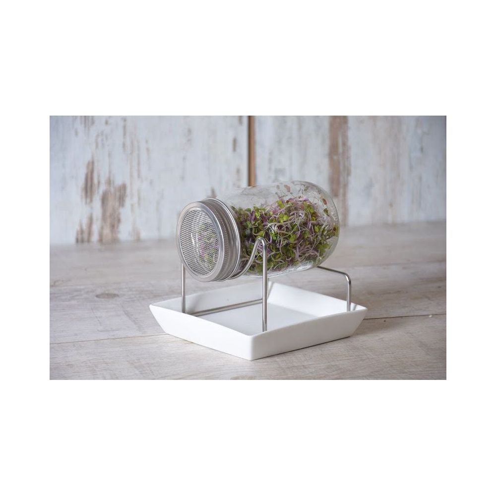 Jeśli lubisz kiełki i chcesz samodzielnie wyhodować je w domowych warunkach to idealna do tego będzie nasza szklana kiełkownica w formie słoika. Jest ona wielokrotnego użytku, więc jest to ekonomiczny i ekologiczny produkt. Metalowy stojak ze stali nierdzewnej pomaga utrzymać słoik pod odpowiednim kątem, a ceramiczna podstawka zbiera spływającą ze słoika wodę. Nowoczesny design i małe gabaryty będą pasowały do każdej kuchni. Dzięki tej metodzie w szybki (już w parę dni), ekonomiczny i łatwy sposób uzyskasz pożywne, zdrowe kiełki. Słoik sprawdzi się w produkcji prawie wszystkich nasion (z wyjątkiem nasion śluzowatych np. rzeżuchy, lnu, chia, rukoli). Dzięki tej kiełkownicy nie będziesz musiał już kupować kiełek w plastikowych opakowaniach (tym samym zmniejszasz zaśmiecanie środowiska) tylko sięgać po nie w domu kiedy tylko będziesz mieć na to ochotę. Ponadto kiełki nie mają styczności z żadnymi tworzywami sztucznymi.