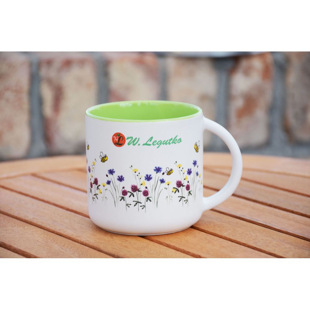 Kubek z grafiką dedykowaną miłośnikom owadów zapylających, wykonany z białej, matowej ceramiki na zewnątrz i błyszczącego wnętrza w kolorze zielonym. Posiada proste, cylindryczne ścianki i niepowtarzalny kształt uchwytu. Kubek o bardzo dużej pojemności. Jego urok sprawia że będzie idealny na prezent.