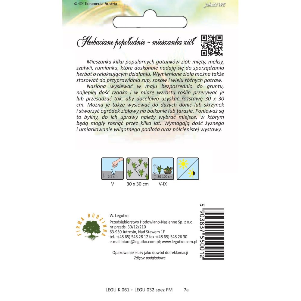 Mieszanka kilku popularnych gatunków ziół: mięty, melisy, szałwii, rumianku, które doskonale nadają się do sporządzania herbat o relaksującym działaniu. Wymienione zióła można także stosować do przyprawiania zup, sosów i wielu różnych potraw. Nasiona wysiewać w maju bezpośrednio do gruntu, najlepiej dość rzadko i w miarę wzrostu roślin przerywać je lub przesadzać tak, aby docelowo uzyskać rozstawę 30x30cm. Można je także wysiewać do dużych donic lub skrzynek i stworzyć ogródek ziołowy na balkonie lub tarasie. Ponieważ są to byliny, do ich uprawy należy wybrać miejsce, w którym będą mogły rosnąć przez kilka lat. Wymagają dość żyznego i umiarkowanie wilgotnego podłoża oraz słonecznej lub pół cienistej wystawy.