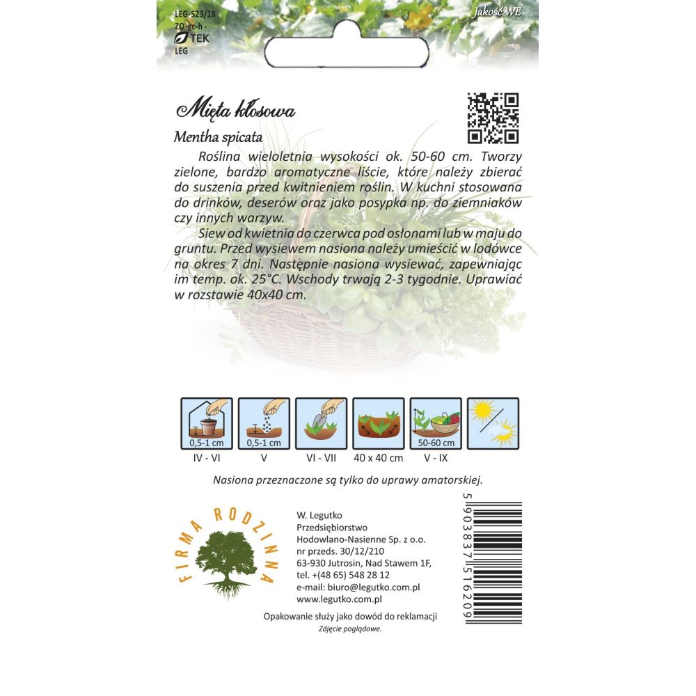 Roślina wieloletnia wysokości ok. 50-60 cm. Tworzy zielone, bardzo aromatyczne liście, które należy zbierać do suszenia przed kwitnieniem roślin. W kuchni stosowana do drinków, deserów oraz jako posypka np. do ziemniaków czy innych warzyw. Siew w kwietniu pod osłonami lub w maju do gruntu. Przed wysiewem nasiona należy umieścić w lodówce na okres 7 dni. Następnie nasiona wysiewać, zapewniając im temp. ok. 25 stopni C. Wschody trwają 2-3 tygodnie. Uprawiać w rozstawie 40x40 cm.