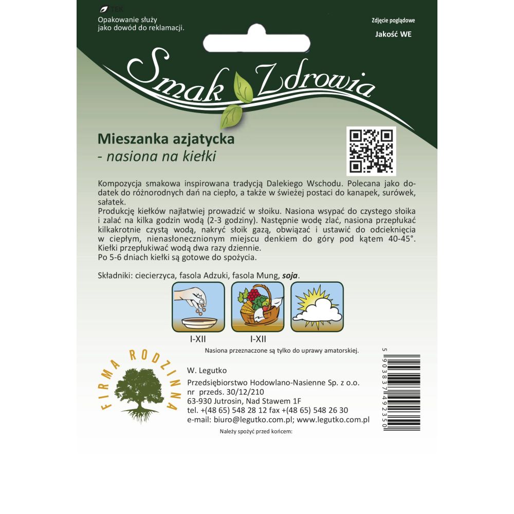 Kompozycja smakowa inspirowana tradycją Dalekiego Wschodu. Mieszanka zawiera nasiona: ciecierzycy, fasoli Mung, fasoli Adzuki oraz soi. Wyprodukowane z nich kiełki stanowią cenne źródło łatwo przyswajalnego wapnia, białka i wielu witamin. Produkcję kiełków najłatwiej prowadzić na kiełkownicy: wypłukane nasiona zamoczyć na 3-6 godzin w ciepłej, przegotowanej wodzie, a następnie równomiernie rozłożyć na siatce naczynia na kiełki. Dodać wody do dolnego poziomu siatki i dbać o jej systematyczne uzupełnienie i wymianę. Kiełki można także produkować w słoiku: wypłukane nasiona wsypać do czystego słoika i zalać na kilka godzin wodą. Następnie wodę zlać, nasiona przepłukać, nakryć słoik gazą, obwiązać i ustawić w ciepłym, nasłonecznionym miejscu. Kiełki przepłukiwać i zlewać wodę dwa razy dziennie. Po 4-5 dniach kiełki są gotowe do spożycia.