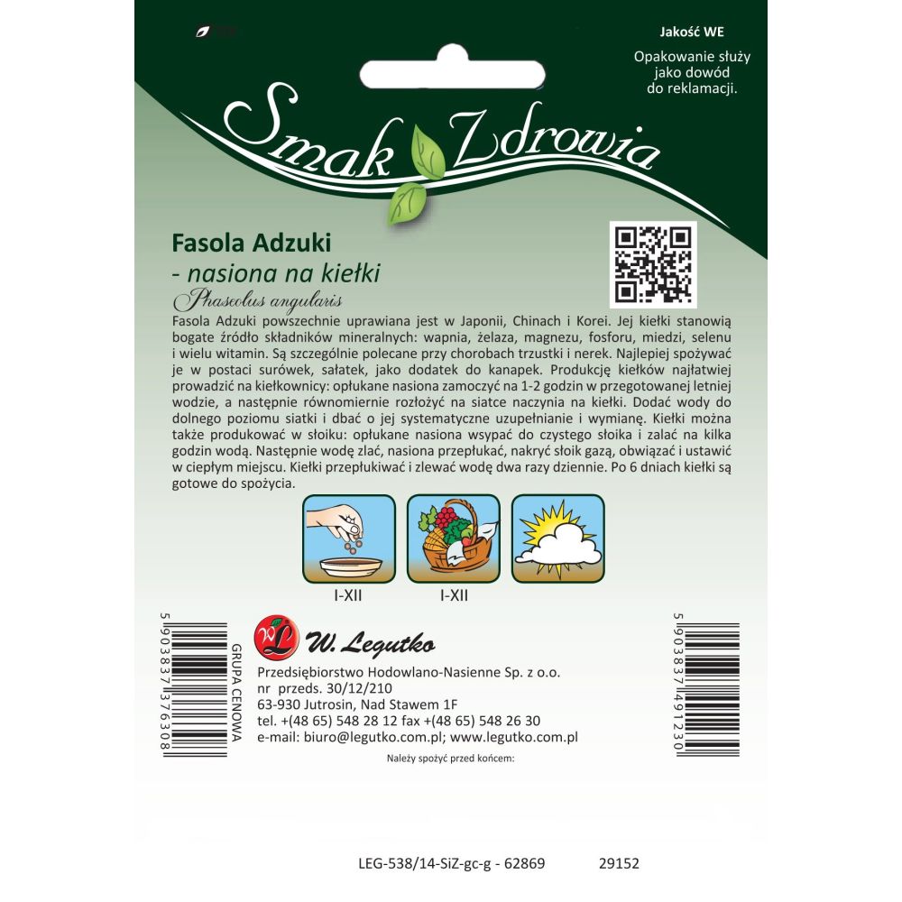 Fasola Adzuki powszechnie uprawiana jest w Japonii, Chinach i Korei. Jej kiełki stanowią bogate źródło składników mineralnych: wapnia, żelaza, magnezu, fosforu, miedzi, selenu i wielu witamin. Są szczególnie polecane przy chorobach trzustki i nerek. Najlepiej spożywać je w postaci surówek, sałatek, jako dodatek do kanapek. Produkcję kiełków najłatwiej prowadzić na kiełkownicy: wypłukane nasiona zamoczyć na 3-6 godzin w ciepłej, przegotowanej wodzie, a następnie równomiernie rozłożyć na siatce naczynia na kiełki. Dodać wody do dolnego poziomu siatki i dbać o jej systematyczne uzupełnienie i wymianę. Kiełki można także produkować w słoiku: wypłukane nasiona do czystego słoika i zalać na kilka godzin wodą. Następnie wodę zalać, nasiona przepłukać, nakryć słoik gazą i ustawić w ciepłym miejscu.