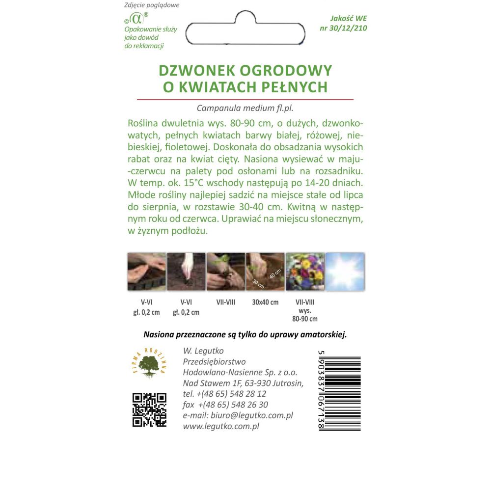 Roślina dwuletnia wys. 80-90 cm, o dużych, dzwonkowatych, pełnych kwiatach barwy białej, różowej, niebieskiej, fioletowej. Doskonała do obsadzania wysokich rabat oraz na kwiat cięty. Nasiona wysiewać w maju-czerwcu na palety lub na rozsadniku. W temp. 15°C wschody następują po 14-20 dniach. Młode rośliny najlepiej sadzić na miejsce stałe od lipca do sierpnia, w rozstawie 30-40 cm. Kwitną w następnym roku od lipca. Uprawiać na słonecznym, w żyznym podłożu.