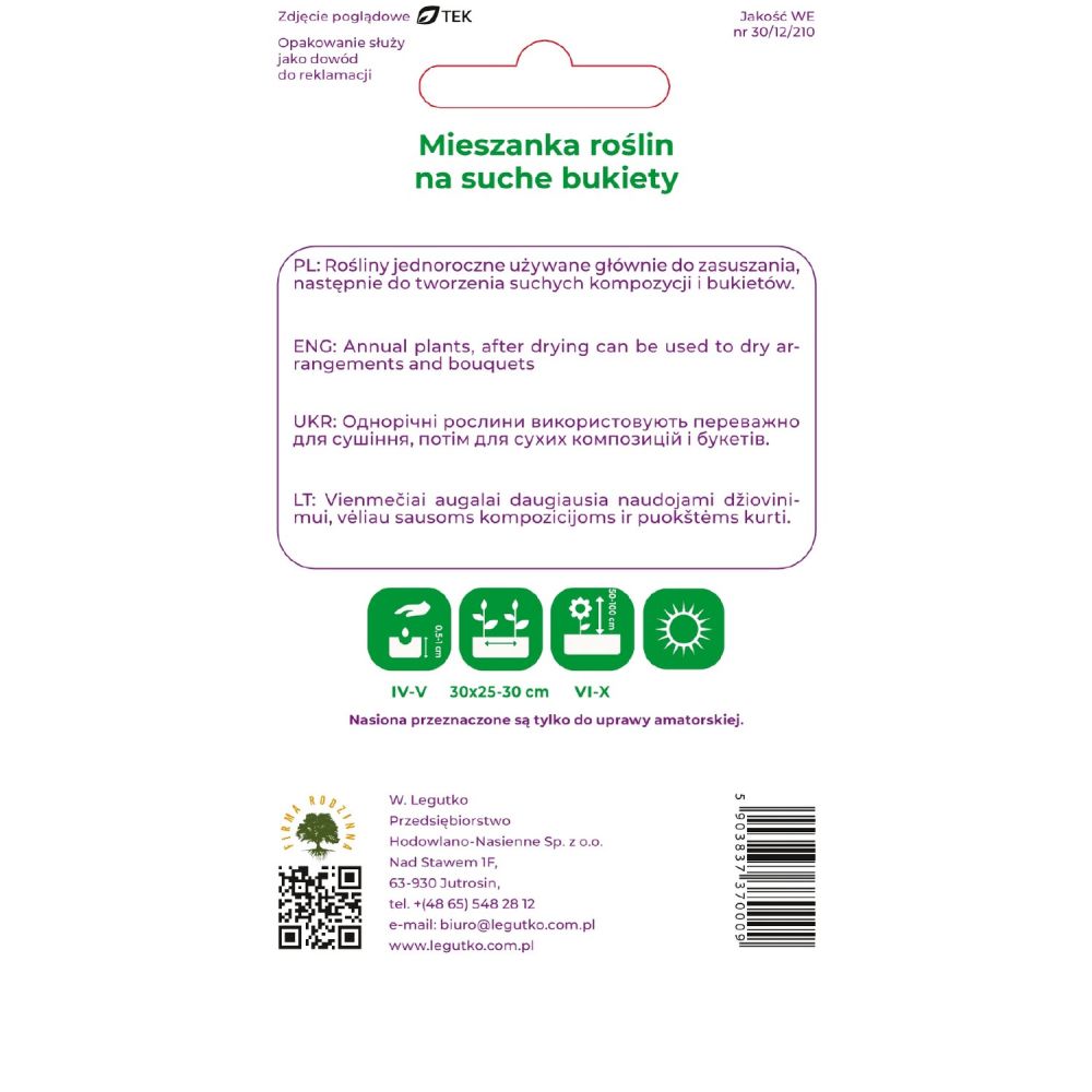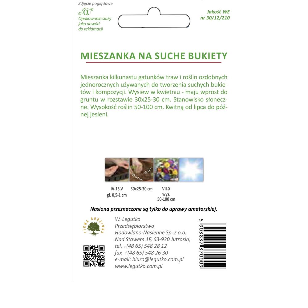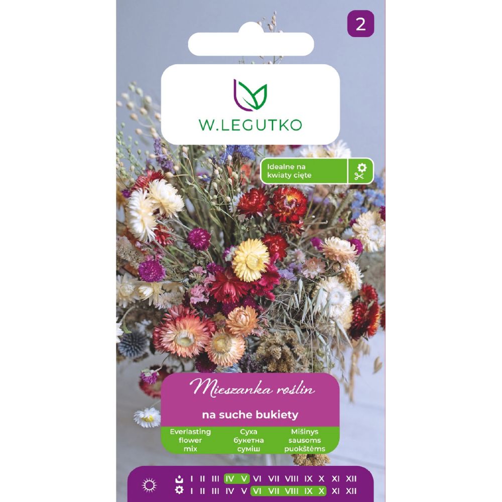 Mieszanka kilkunastu gatunków traw i roślin ozdobnych jednorocznych używanych do tworzenia suchych bukietów i kompozycji. Wysiew w kwietniu-maju wprost do gruntu w rozstawie 25 x 30 cm. Stanowisko słoneczne. Wysokość roślin 50 - 100 cm. Kwitną od lipca do późnej jesieni.