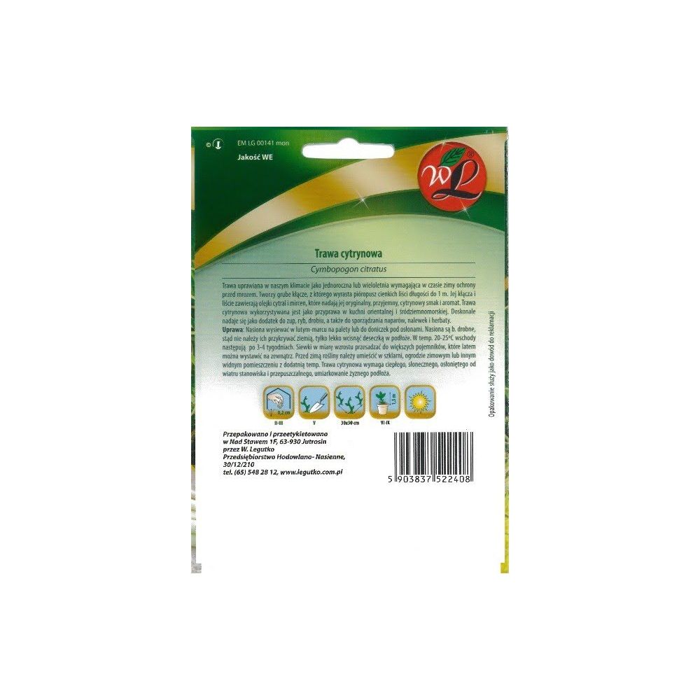 Trawa uprawiana w naszym klimacie jako jednoroczna lub wieloletnia wymagająca w czasie zimy ochrony przed mrozem. Tworzy grube kłącze, z którego wyrasta pióropusz cienkich liści długości do 1 m. Jej kłącza i liście zawierają olejki cytral i mircen, które nadają jej oryginalny, przyjemny, cytrynowy smak i aromat. Trawa cytrynowa wykorzystywana jest jako przyprawa w kuchni orientalnej i śródziemnomorskiej. Doskonale nadaje się jako dodatek do zup, ryb, drobiu, a także do sporządzenia naparów, nalewek i herbaty. Uprawa: Nasiona wysiewać w lutym-marcu na palety lub do doniczek pod osłonami. Nasiona są b.drobne, stąd nie należy ich przykrywać ziemią, tylko lekko wcisnąć deseczką w podłoże. W temp. 20-25°C wschody następują po 3-4 tygodniach. Siewki w miarę wzrostu przesadzać do większych pojemników, które latem można wystawić na zewnątrz. Przed zimą rośliny należy umieścić w szklarni, ogrodzie zimowym lub innym widnym pomieszczeniu z dodatnią temp. Trawa cytrynowa wymaga ciepłego, słonecznego, osłoniętego od wiatru stanowiska i przepuszczalnego, umiarkowanie żyznego podłoża.