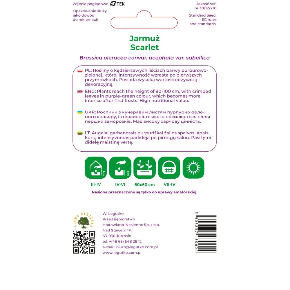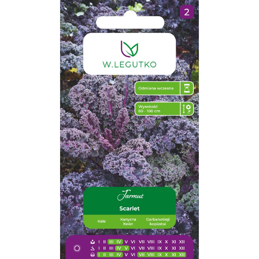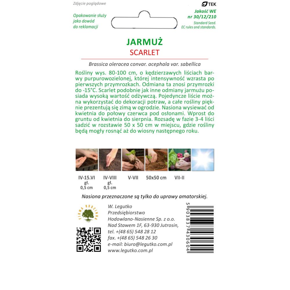 Rośliny wys. 80-100 cm, o kędzierzawych liściach barwy purpurowozielonej, której intensywność wzrasta po pierwszych przymrozkach. Odmiana ta znosi przymrozki do -15 stopni C. Scarlet podobnie jak inne odmiany jarmużu posiada wysoką wartość odżywczą. Pojedyncze liście można wykorzystać do dekoracji potraw, a całe rośliny pięknie prezentują się zimą w ogrodzie. Nasiona wysiewać od kwietnia do połowy czerwca pod osłonami lub bezpośrednio do gruntu, w zależności od terminu zbioru. Rozsadę w fazie 3-4 liści sadzić w rozstawie 70x60 cm, w miejscu, gdzie rośliny będą mogły rosnąć aż do wiosny następnego roku.