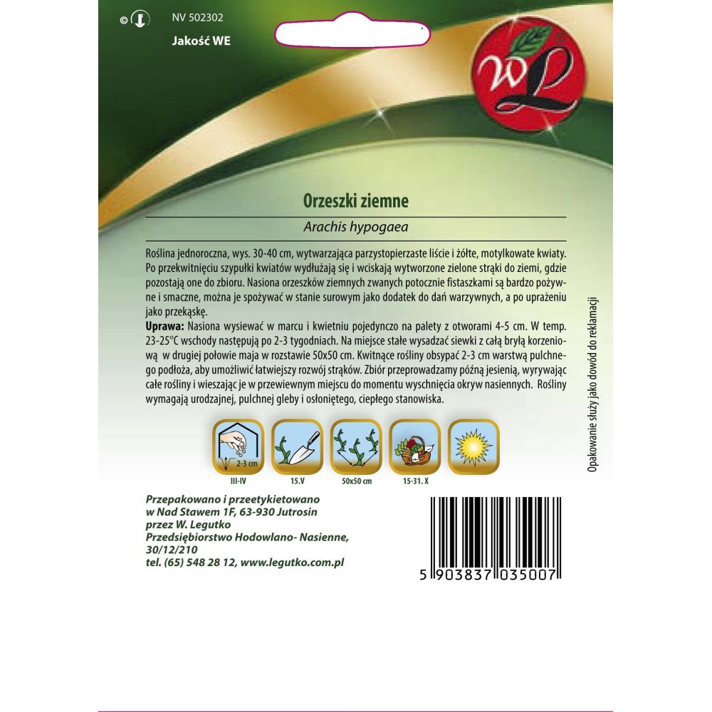 UPRAWA: Nasiona wysiewać w marcu i kwietniu pojedynczo na palety z otworami 4-5cm. W temp. 23-25°C wschody następują po 2-3 tygodniach. Na miejsce stałe wysadzać siewki z całą bryłą korzeniową w drugiej połowie maja w rozstawie 50x50cm. Kwitnące rośliny obsypać 2-3cm warstwą pulchnego podłoża, aby umożliwić łatwiejszy rozwój strąków. Zbiór przeprowadzamy późną jesienią, wyrywając całe rośliny i wieszając je w przewiewnym miejscu do momentu wyschnięcia okryw nasiennych. Rośliny wymagają urodzajnej, pulchnej gleby i osłoniętego, ciepłego stanowiska.