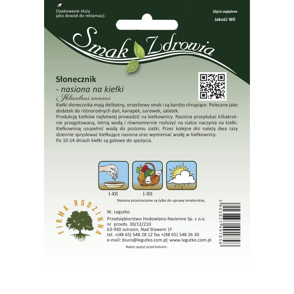 Kiełki słonecznika dostarczają organizmowi fosforu i wapnia, który wzmacnia kości i zęby oraz niezbędnego w procesie krwiotwórczym żelaza. Dodatkowo zawierają również magnez, potas oraz miedź i cynk. Powinni je włączyć do diety narażeni na niedobór tych pierwiastków wegetarianie. Są także bogatym źródłem witaminy D, oraz białka i nienasyconych kwasów tłuszczowych. Produkcję kiełków najłatwiej prowadzić na kiełkownicy: wypłukane nasiona zamoczyć na 3-6 godzin w ciepłej, przegotowanej wodzie, a następnie równomiernie rozłożyć na siatce naczynia na kiełki. Dodać wody do dolnego poziomu siatki i dbać o jej systematyczne uzupełnianie i wymianę. Po 6-7 dniach kiełki są gotowe do spożycia.
