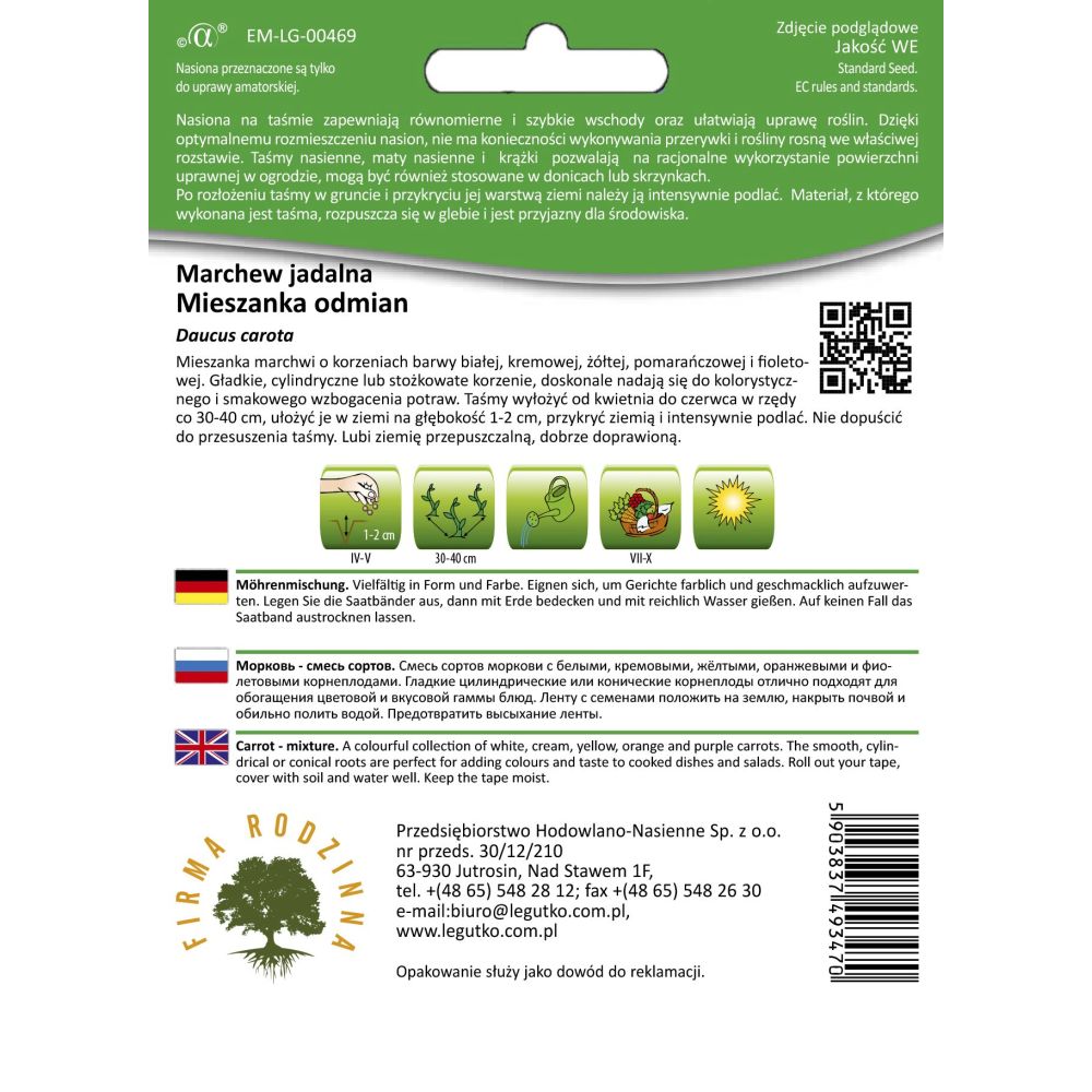 Mieszanka marchwi o korzeniach barwy białej, żółtej, pomarańczowej i fioletowej. Gładkie, cylindryczne lub stożkowate korzenie doskonale nadają się do kolorystycznego i smakowego wzbogacenia potraw. Taśmy wyłożyć od kwietnia do czerwca w rzędy co 30-40 cm, ułożyć je w ziemi na głębokość 1-2 cm, przykryć ziemią i intensywnie podlać. Nie dopuścić do przesuszenia taśmy. Lubią ziemię przepuszczalną, dobrze doprawioną.