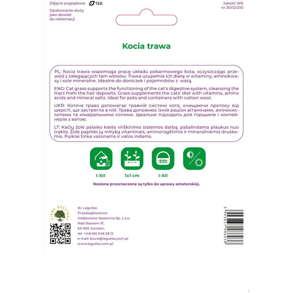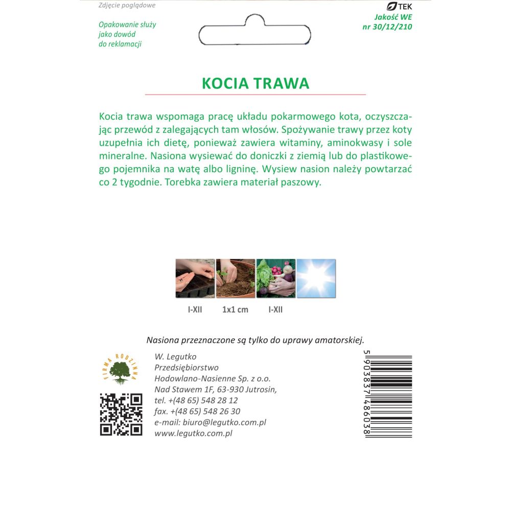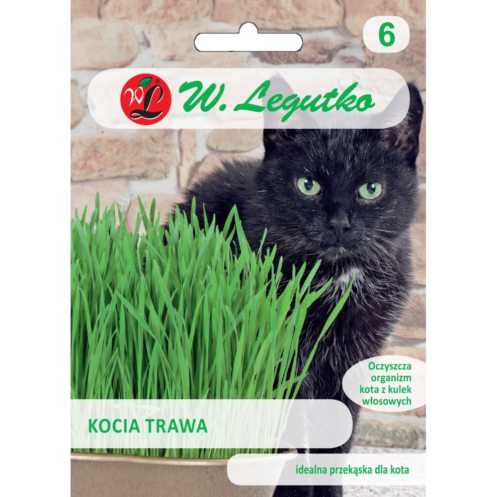 Kocia trawa wspomaga pracę układu pokarmowego kota, oczyszczając przewód z zalegających tam włosów. Spożywanie trawy przez koty uzupełnia ich dietę, ponieważ zawiera witaminy, aminokwasy i sole mineralne. Nasiona wysiewać do doniczki z ziemią lub do plastikowego pojemnika na watę lub ligninę. Wysiew nasion należy powtarzać co 2 tygodnie. Torebka zawiera materiał paszowy.