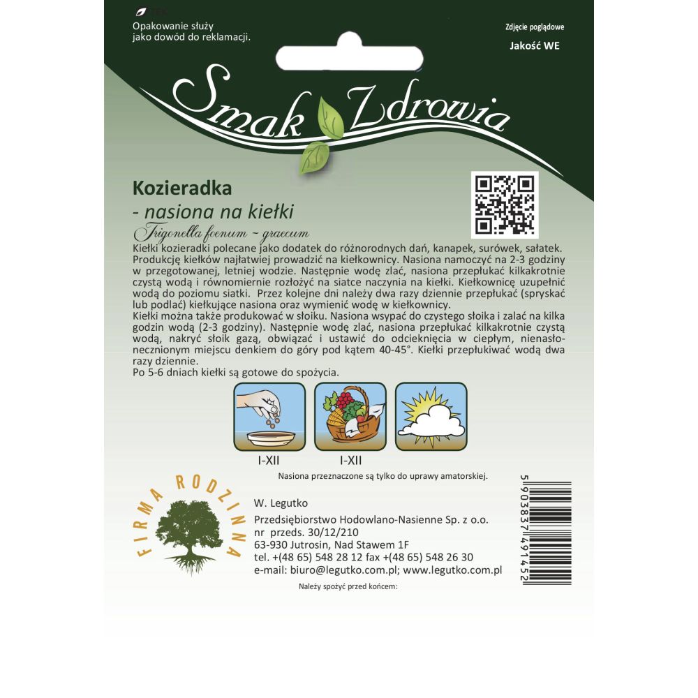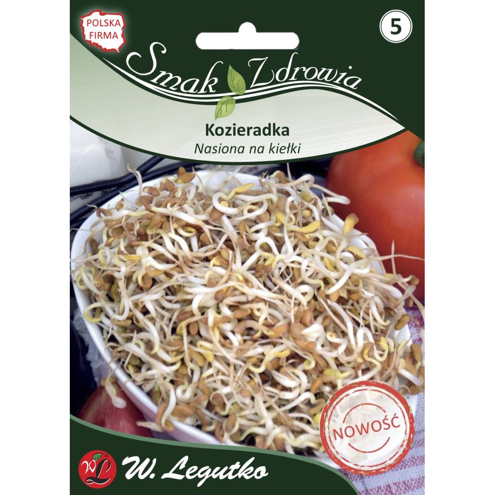 Kiełki są dla organizmu źródłem cennych składników odżywczych. Nasiona kozieradki zawierają liczne witaminy z grupy witaminy A, B, C i D, oraz żelaza, fosforu i potasu. Spożywanie kiełków kozieradki korzystnie wpływa na oczyszczanie organizmu. Kiełki kozieradki polecane są jako dodatek do surówek, sałatek, kanapek. Produkcję kiełków najłatwiej prowadzić na kiełkownicy: opłukane nasiona zamoczyć na 3-6 godzin w ciepłej, przegotowanej wodzie, a następnie równomiernie rozłożyć je na siatce kiełkownicy. Nalać wody do poziomu siatki i dbać o jej systematyczne uzupełnianie i wymianę, jednocześnie zraszając nasiona w ciągu kilku następnych dni. Kiełki można także produkować w słoiku: opłukane nasiona wsypać do czystego słoika i zalać na kilka godzin wodą. Następnie wodę zlać, nasiona przepłukać, nakryć słoik gazą, obwiązać i ustawić w ciepłym, nienasłonecznionym miejscu. Kiełki przepłukiwać i zlewać wodę dwa razy dziennie. Po 3-4 dniach kiełki są gotowe do spożycia.