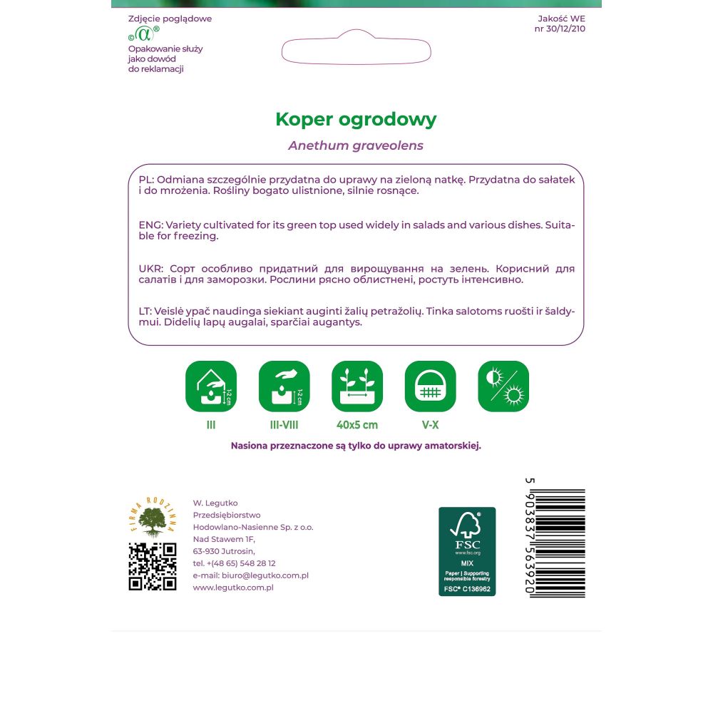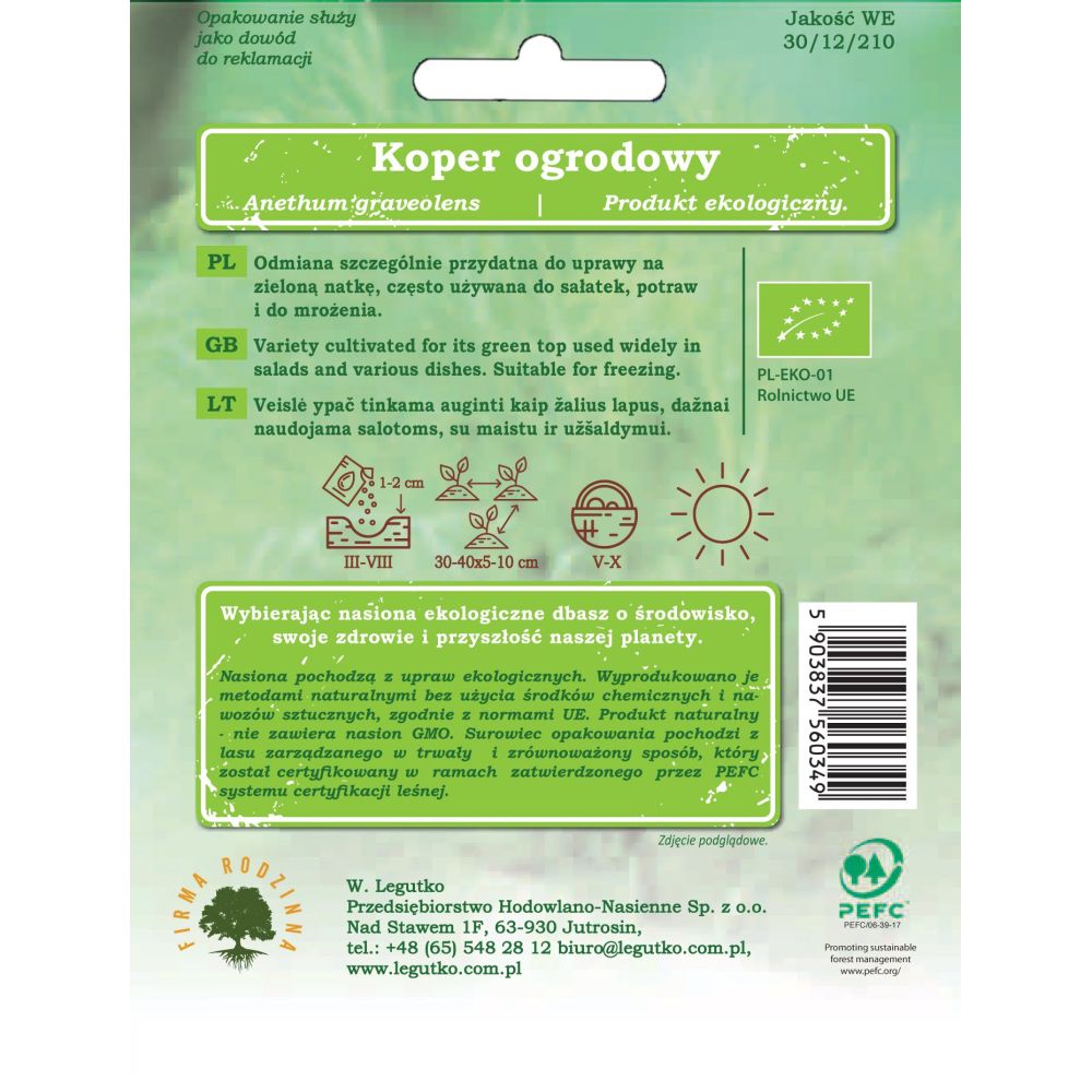 Nasiona pochodzą z upraw ekologicznych. Wyprodukowano je metodami naturalnymi bez użycia środków chemicznych i nawozów sztucznych, zgodnie z normami UE. Produkt naturalny - nie zawiera nasion GMO. Papier pod opakowanie wytworzono z materiałów pochodzących z dobrze zarządzanych lasów posiadających certyfikat FSC i innych kontrolowanych źródeł.
