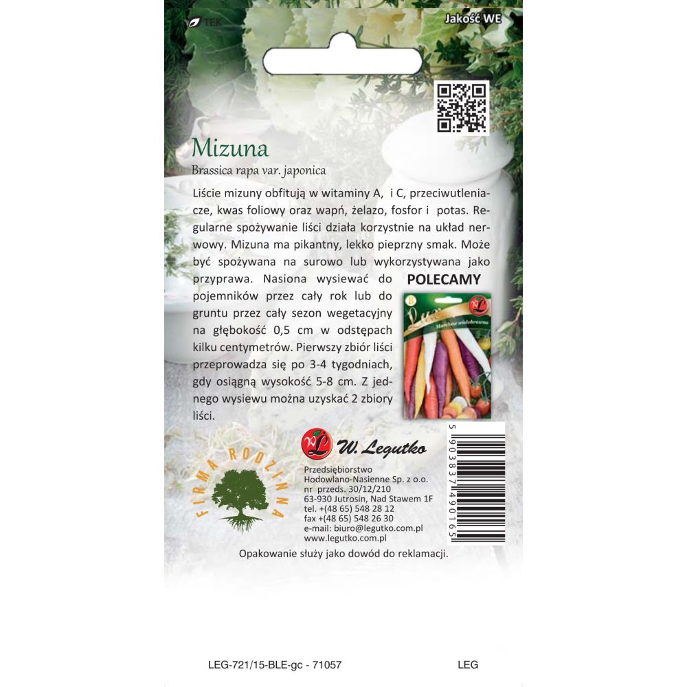 Liście mizuny obfitują w witaminy A, i C, przeciwutleniacze, kwas foliowy oraz wapń, żelazo, fosfor i potas. Regularne spożywanie liści działa korzystnie na układ nerwowy. Mizuna ma pikantny, lekko pieprzny smak. Może być spożywana na surowo lub wykorzystywana jako przyprawa. Nasiona wysiewać do pojemników przez cały rok lub do gruntu przez cały sezon wegetacyjny na głębokość 0,5 cm w odstępach kilku centymetrów. Pierwszy zbiór liści przeprowadza się po 3‐4 tygodniach, gdy osiągną wysokość 5‐8 cm. Z jednego wysiewu można uzyskać 2 zbiory liści.