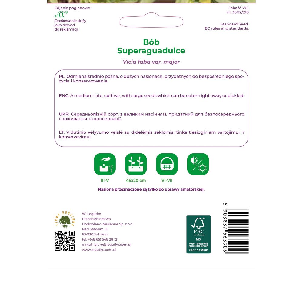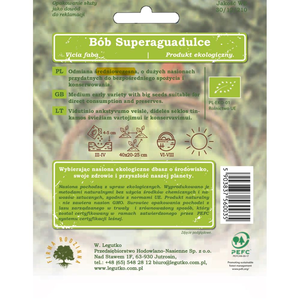 Nasiona pochodzą z upraw ekologicznych. Wyprodukowano je metodami naturalnymi bez użycia środków chemicznych i nawozów sztucznych, zgodnie z normami UE. Produkt naturalny - nie zawiera nasion GMO. Papier pod opakowanie wytworzono z materiałów pochodzących z dobrze zarządzanych lasów posiadających certyfikat FSC i innych kontrolowanych źródeł.