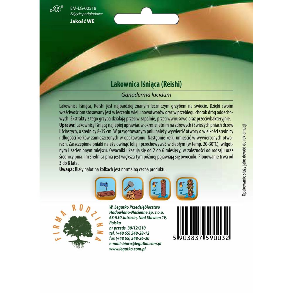 Uprawa: Lakownicę lśniącą najlepiej uprawiać w okresie letnim na zdrowych i świeżych pniach drzew liściastych, o średnicy 8-15 cm. W przygotowanym pniu należy wywiercić otwory o wielkości średnicy i długości kołków zamieszczonych w opakowaniu. Następnie kołki umieścić w wywierconych otworach. zaszczepione pniaki należy owinąć folią i przechowywać w ciepłym (temp. 20-30 stopni) wilgotnym i zaciemnionym miejscu. Owocniki ukazują się od 2 do 6 miesięcy, w zależności od rodzaju oraz średnicy pnia. Im średnica pnia jest większa tym później pojawiają się owocniki. Plonowanie trwa od 3 do 8 lat.