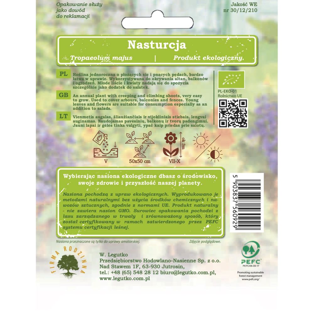 Nasiona pochodzą z upraw ekologicznych. Wyprodukowano je metodami naturalnymi bez użycia środków chemicznych i nawozów sztucznych, zgodnie z normami UE. Produkt naturalny - nie zawiera nasion GMO. Papier pod opakowanie wytworzono z materiałów pochodzących z dobrze zarządzanych lasów posiadających certyfikat FSC i innych kontrolowanych źródeł.