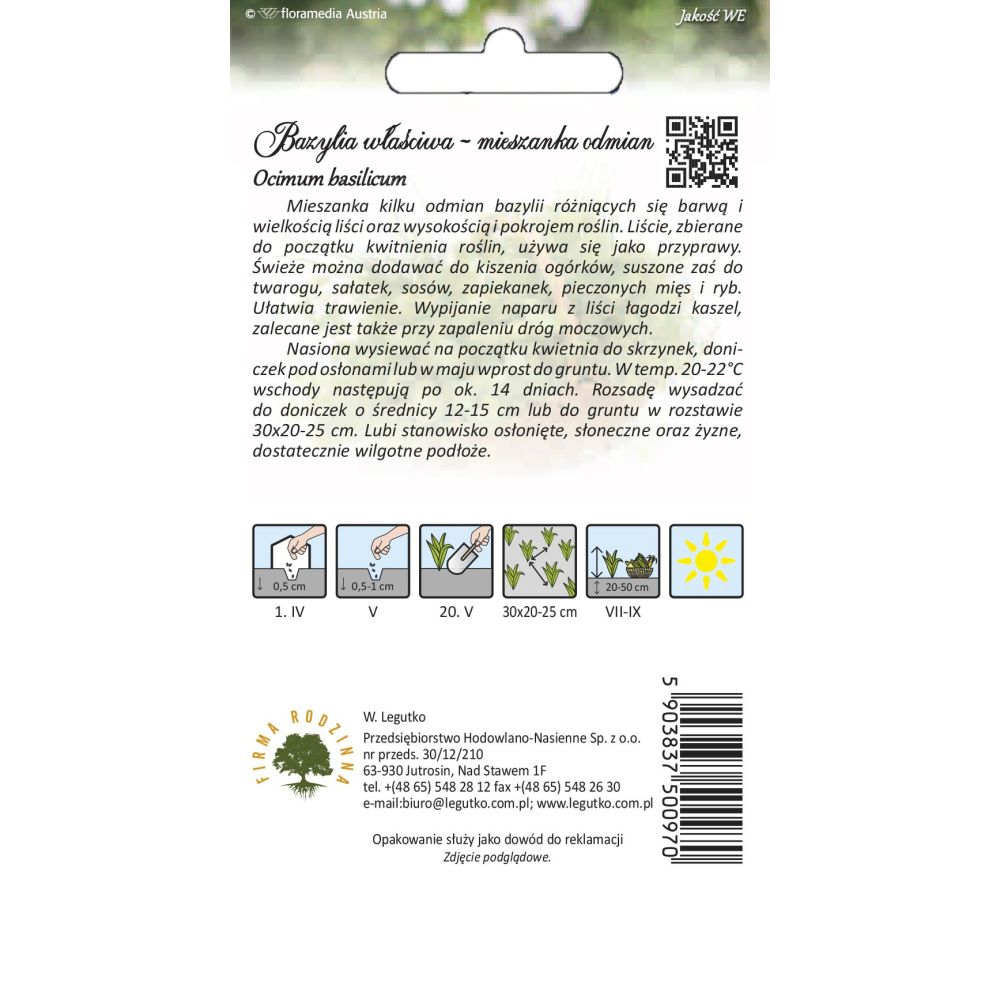 Mieszanka kilku odmian bazylii różniących się barwą i wielkością liści oraz wysokością i pokrojem roślin. Liście zbierane do początku kwitnienia roślin, używa się jako przyprawy. Świeże można dodawać do kiszenia ogórków, suszone zaś do twarogu, sałatek, sosów, zapiekanek, pieczonych mięs i ryb. Ułatwia trawienie. Wypijanie naparu z liści łagodzi kaszel, zalecane jest także przy zapaleniu dróg moczowych. Nasiona wysiewać na początku kwietnia do skrzynek, doniczek pod osłonami lub w maju wprost do gruntu. W temp 20-22 °C wschody następują po ok. 14 dniach. Rozsadę wysadzać do doniczek o średnicy 12-15 cm lub do gruntu w rozstawie 30x20-25 cm. Lubi stanowisko osłonięte, słoneczne oraz żyzne, dostatecznie wilgotne podłoże.