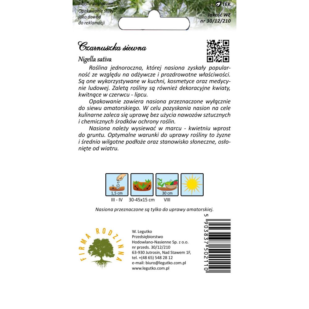 Roślina jednoroczna, której nasiona zyskały popularność ze względu na odżywcze i prozdrowotne właściwości. Są one wykorzystywane w kuchni, kosmetyce oraz medycynie ludowej. Zaletą rośliny są również dekoracyjne kwiaty, kwitnące w czerwcu - lipcu. Opakowanie zawiera nasiona przeznaczone wyłącznie do siewu amatorskiego. W celu pozyskania nasion na cele kulinarne zaleca się uprawę bez użycia nawozów sztucznych i chemicznych środków ochrony roślin. Nasiona należy wysiewać w marcu-kwietniu wprost do gruntu. Optymalne warunki do uprawy rośliny to żyzne i średnio wilgotne podłoże oraz stanowisko słoneczne, osłonięte od wiatru.