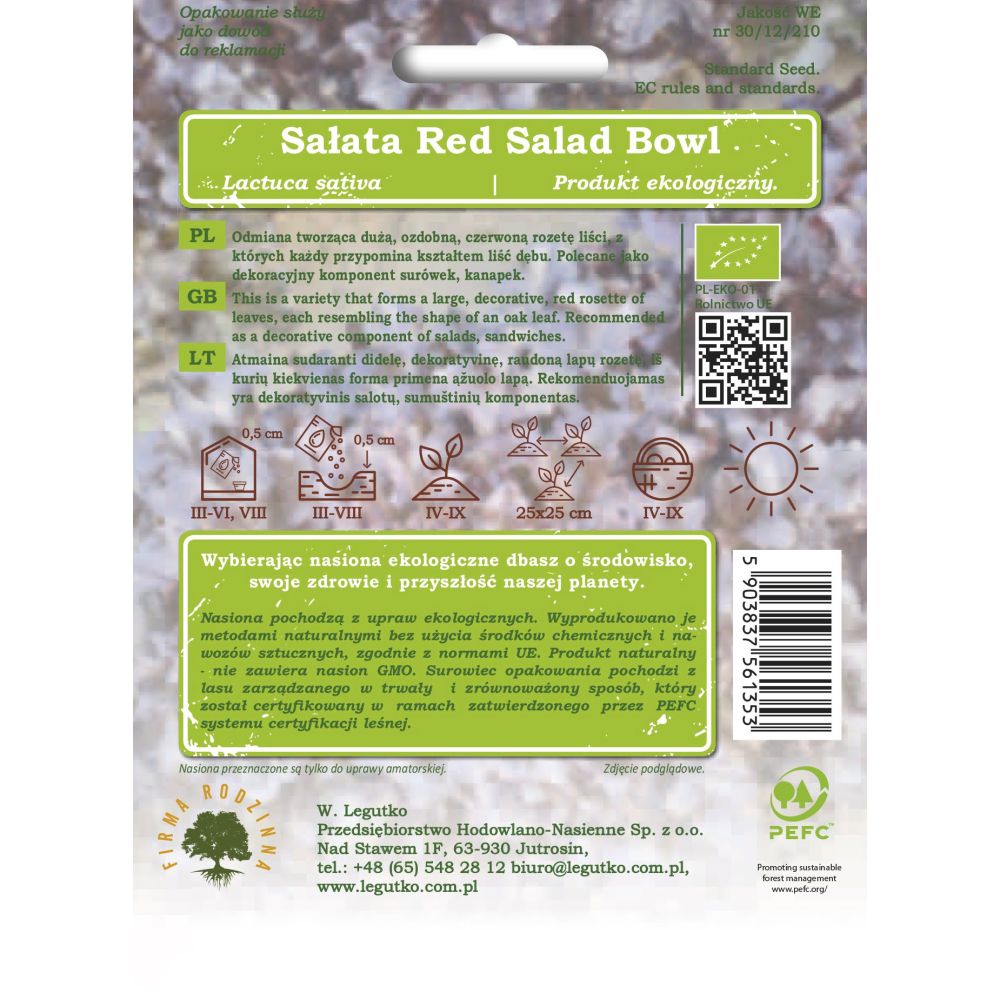 Nasiona pochodzą z upraw ekologicznych. Wyprodukowano je metodami naturalnymi bez użycia środków chemicznych i nawozów sztucznych, zgodnie z normami UE. Produkt naturalny - nie zawiera nasion GMO. Papier pod opakowanie wytworzono z materiałów pochodzących z dobrze zarządzanych lasów posiadających certyfikat FSC i innych kontrolowanych źródeł.