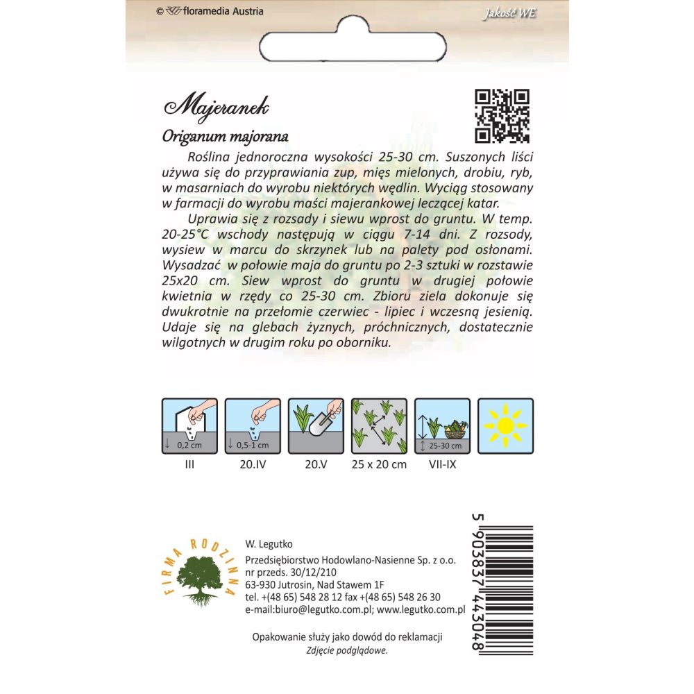 Wyciąg stosowany w farmacji do wyrobu maści majerankowej leczącej katar. Uprawia się z rozsady i siewu wprost do gruntu. W temp. 20-25 °C wschody następują